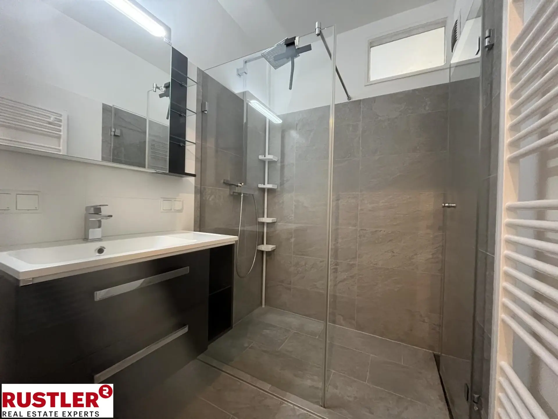 An einer massiven Sicherheitstüre vorbei, betreten Sie den Vorraum. Von dort gelangen Sie ins moderne Badezimmer, ausgestattet mit Waschtisch kombiniert mit Unterschrank, bodenebener Dusche und Handtuchheizkörper sowie zum separaten WC.