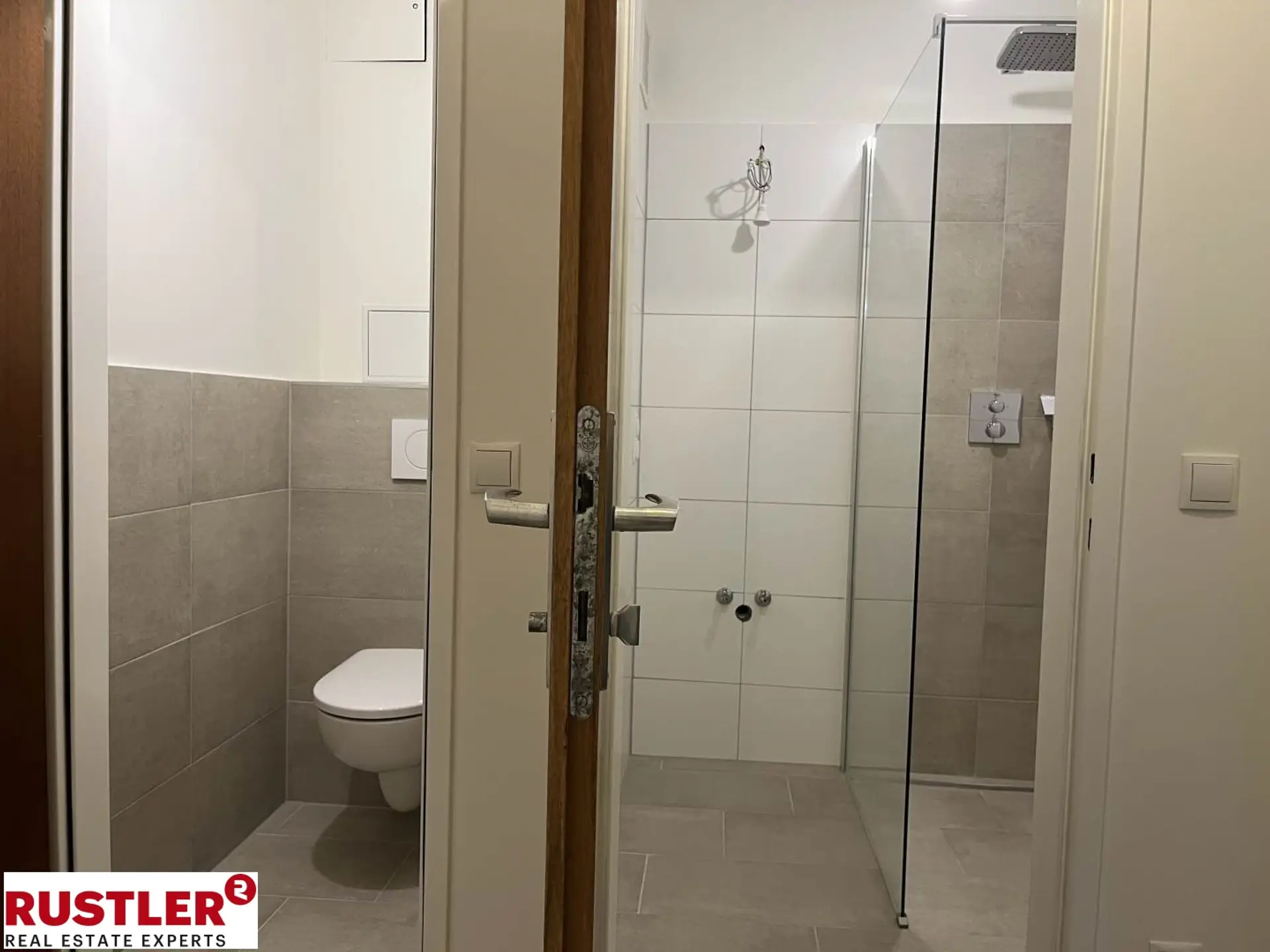 Nach Betreten des Vorraums gelangen Sie ins neue Badezimmer, ausgestattet mit Waschtisch und bodenebener Dusche sowie zum separaten WC.