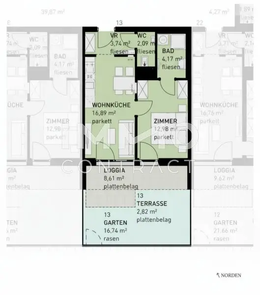 Ausstattung: Boden Fahrstuhl Wohnküche / offene Küche Tiefgarage Parkplatz Fahrradraum Fußbodenheizung Loggia Terrasse Garten