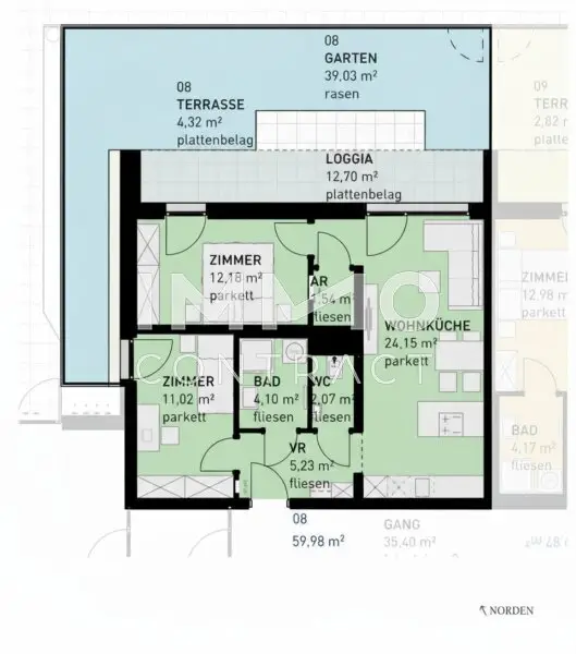 Ausstattung: Boden Fahrstuhl Wohnküche / offene Küche Tiefgarage Parkplatz Fahrradraum Fußbodenheizung Loggia Terrasse Garten