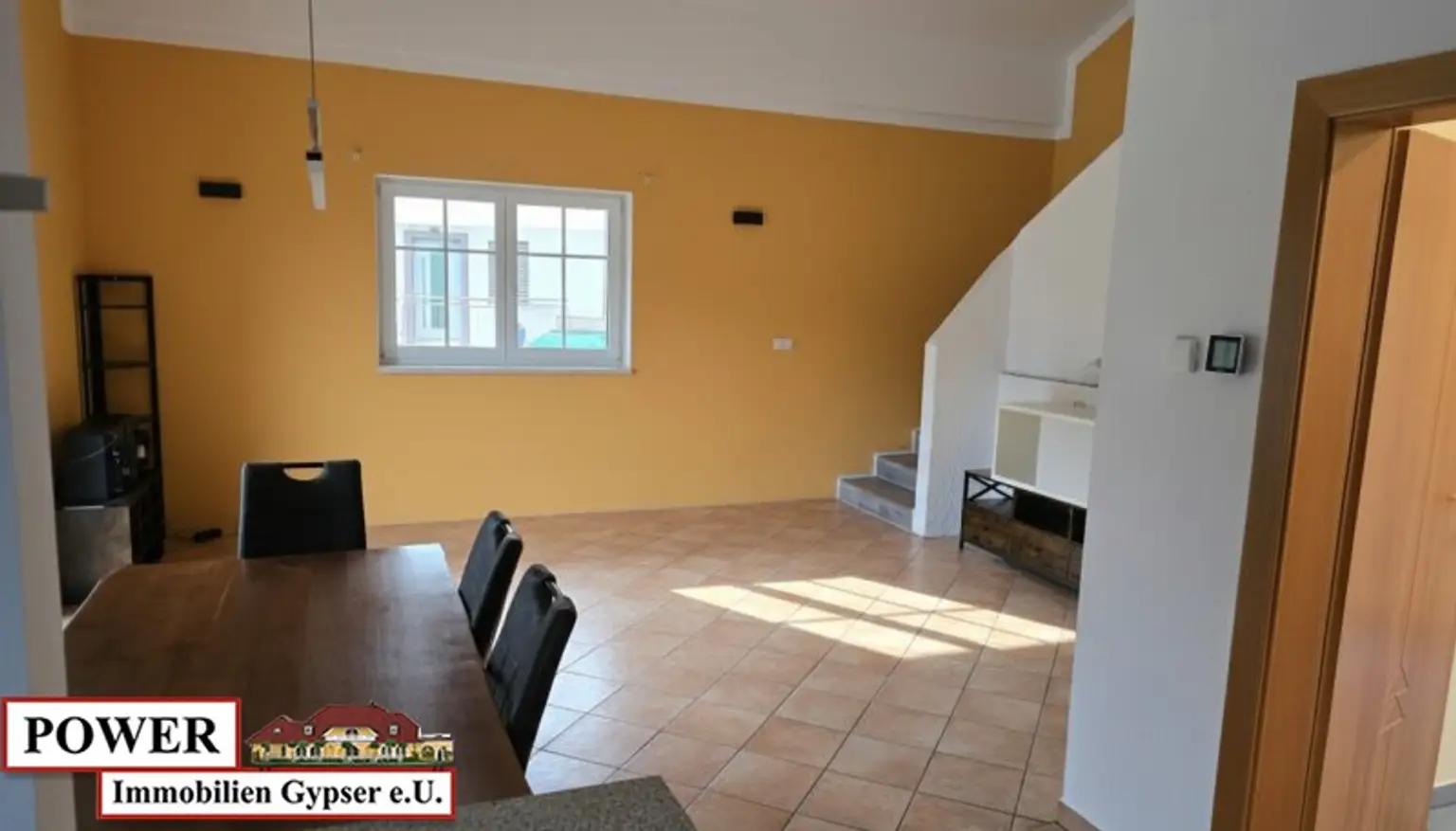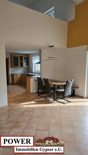Im Erdgeschoss befindet sich der Wohnbereich, dieser ist offen gestaltet und die Küche ist möbliert und ein Schlafzimmer ein Badezimmer WC und Vorraum.