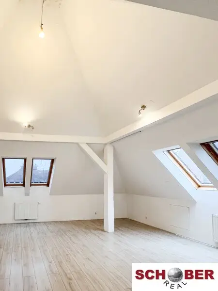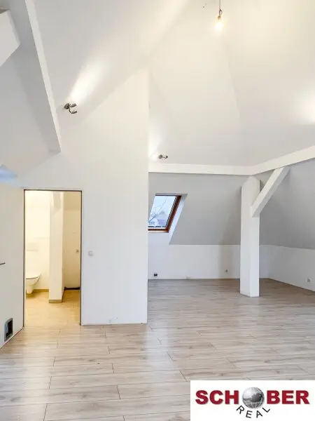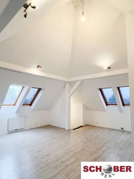 Der nachträglich ausgebaute Dachboden begeistert mit einem lichtdurchfluteten, offenen Wohnraum. Anschlüsse für eine Teeküche sind vorhanden, ebenso ein WC mit Vorbereitung für eine Dusche – ideal als zusätzlicher Wohnbereich, Atelier, Büro oder Gästebereich.