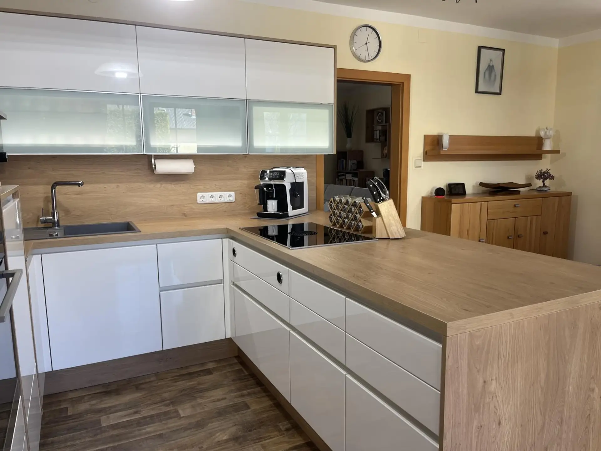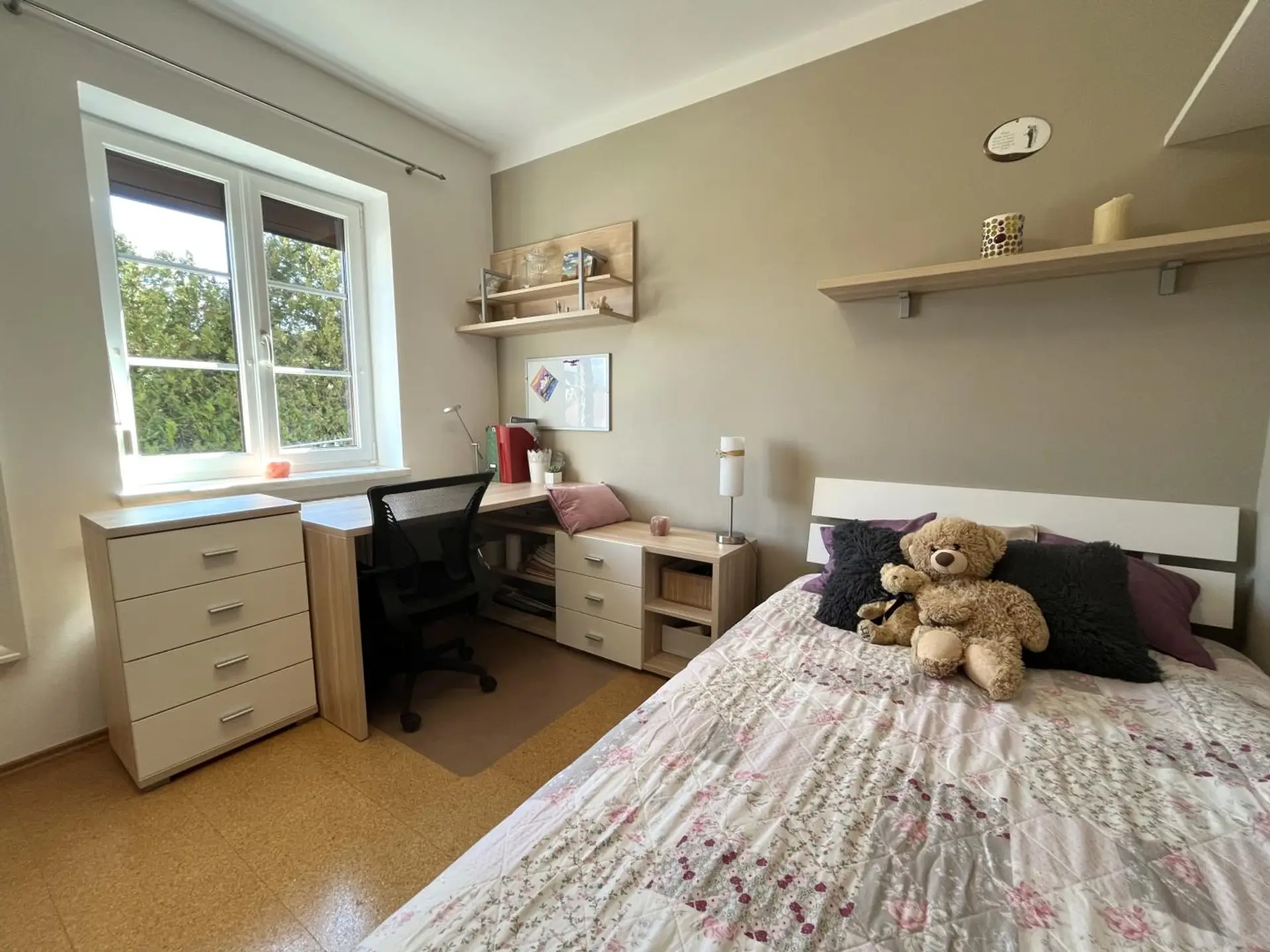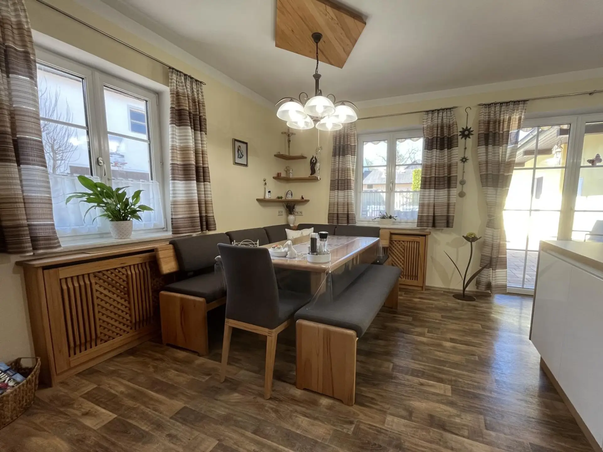 Im Zubau befinden sich drei Schlafzimmer, Wohnzimmer, Küche mit Essplatz, Bad, WC, Abstellraum und ein Wirtschaftsraum. Der Altbestand wurde nicht gänzlich adaptiert, kann aber zu einer eigenen Wohneinheit ausgebaut werden. Geheizt wir das Objekt mittels einer Zentralheizung mit festen Brennstoffen im Keller. Der Keller hat eine Größe von 47 m² und hierdurch ist auch die Doppelgarage mit zwei elektrischen Toren erreichbar. Es sind 2 Brunnen vorhanden welche als Trinkwasser und zum Bewässern genutzt werden.