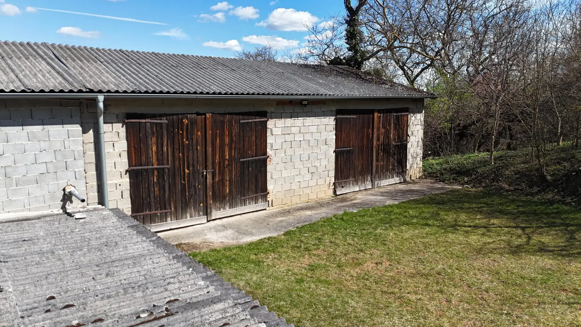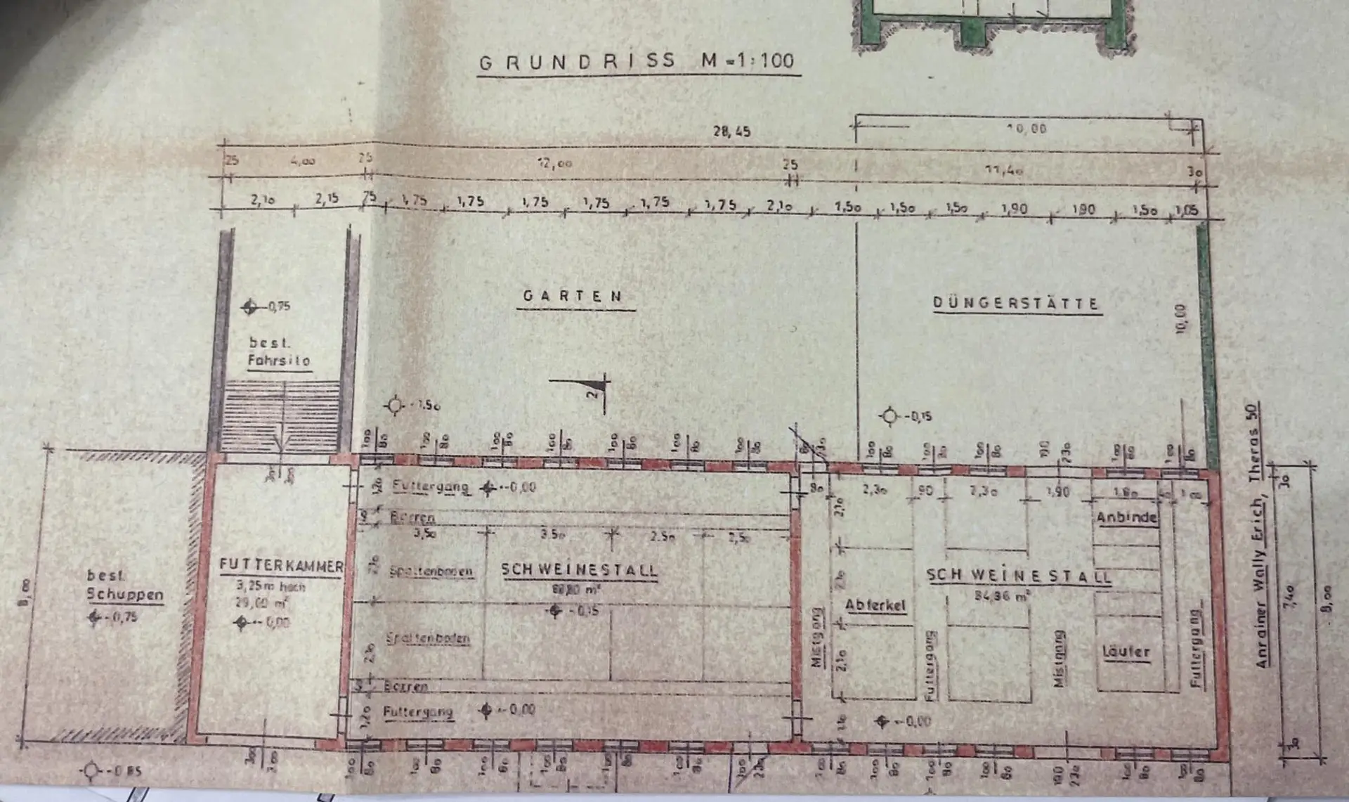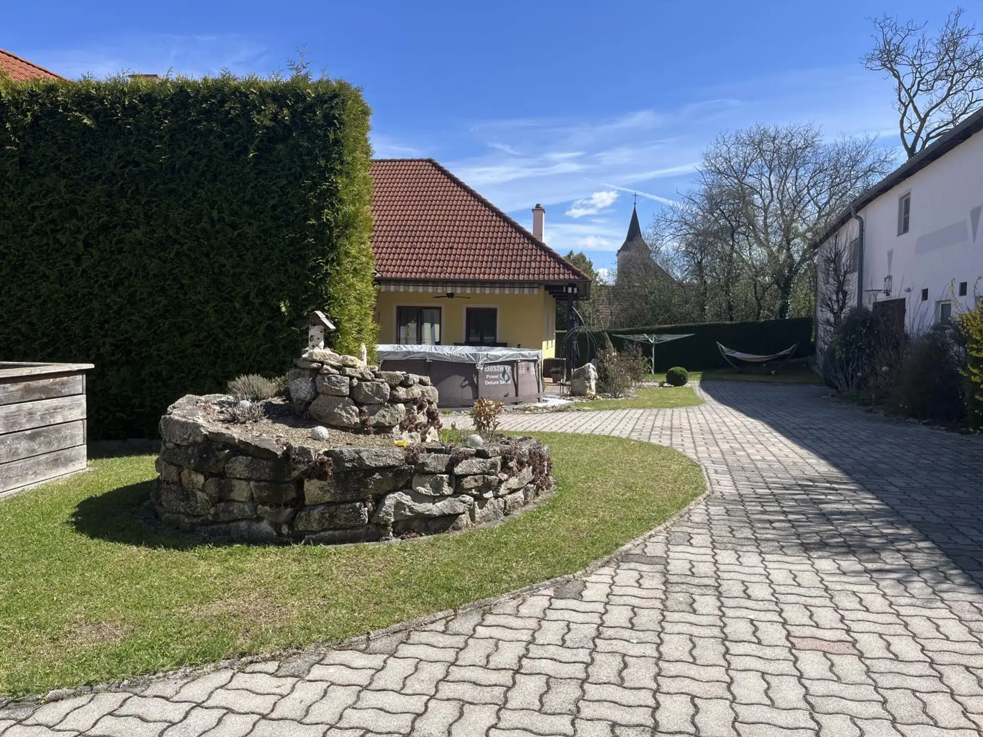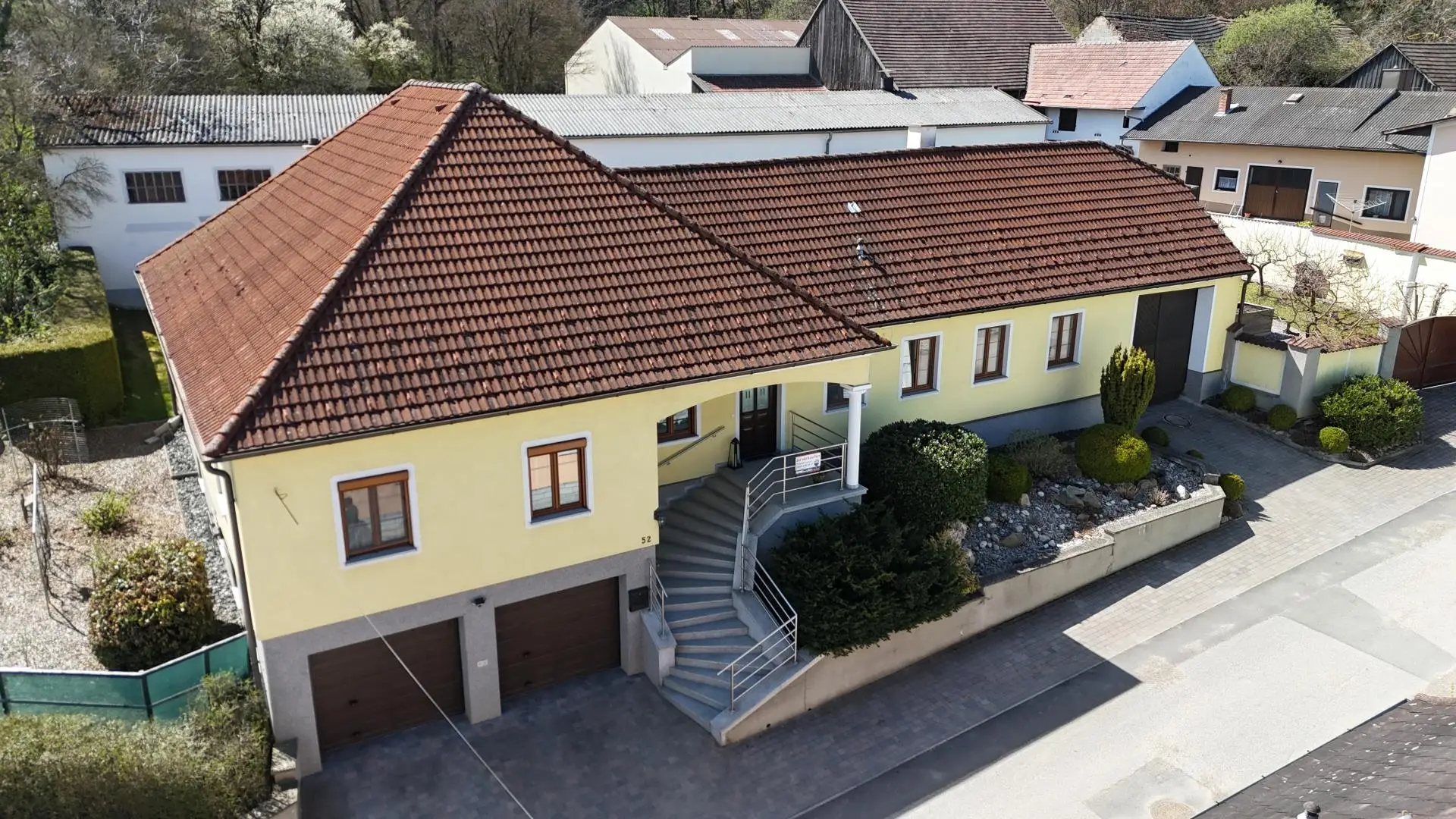 Man gelangt über 2 Einfahrten in den Innenhof welcher über ein Schwimmbad, Terrasse, Hochbeete und Obstbaumbestand verfügt . Hinter dem Haus befindet sich die ehemaligen landwirtschaftlichen Gebäudeteile. Durch den Schuppen gelangt man ebenso in den hintersten Teil des Grundstückes wo sich nochmals ein 126 m² großer Schuppen und eine Zufahrt befindet.