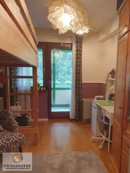 Auch das dritte Zimmer verfügt über einen kleinen Balkon mit Blick ins Grüne, der zusätzlichen Wohnwert schafft und für ein angenehmes Raumgefühl sorgt.