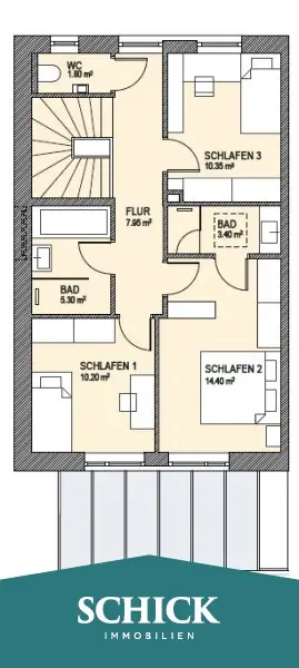 Das Obergeschoss bietet drei helle, freundliche Schlafzimmer sowie ein modernes Familienbad mit Badewanne und Walk-In-Dusche. Ein separates WC sorgt für zusätzlichen Komfort. Als besonderes Highlight gilt das Bad en Suite im Elternschlafzimmer – mit bodengleicher Dusche und elegantem Waschtisch.