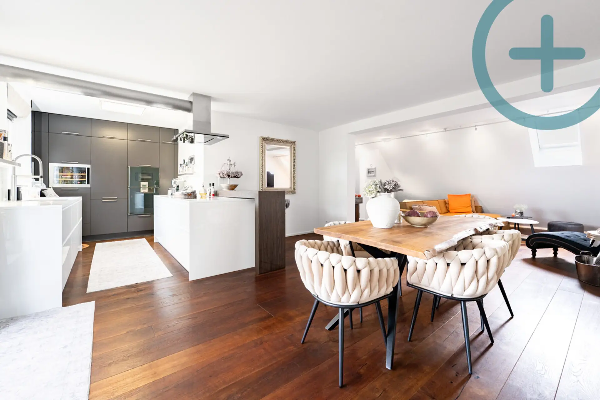Über den Stiegenaufgang öffnet sich das Herzstück der Wohnung: ein rund 70 m² großer Wohn- und Essbereich, der durch seine Helligkeit und Weitläufigkeit beeindruckt. Hier ist genügend Platz für den großen Familientisch und eine gemütliche Sofalandschaft. Die moderne, zur Terrasse ausgerichtete Küche ist hochwertig ausgestattet – inklusive Weinkühler und Dampfgarer – und lädt zum gemeinsamen Kochen ein. Ein weiteres Tageslichtbad mit Badewanne und WC sorgt für zusätzlichen Komfort. Besonderes Highlight sind die beiden Terrassen: Die ca. 21 m² große Terrasse auf Wohnebene bietet Platz für entspannte Nachmittage, während die Dachterrasse mit knapp 28 m² einen fantastischen Ausblick über Korneuburg eröffnet – ein Ort für unvergessliche Familienmomente im Freien. Zusätzlich kann ein PKW Abstellplatz im Freien um EUR 9.000,- erworben werden.