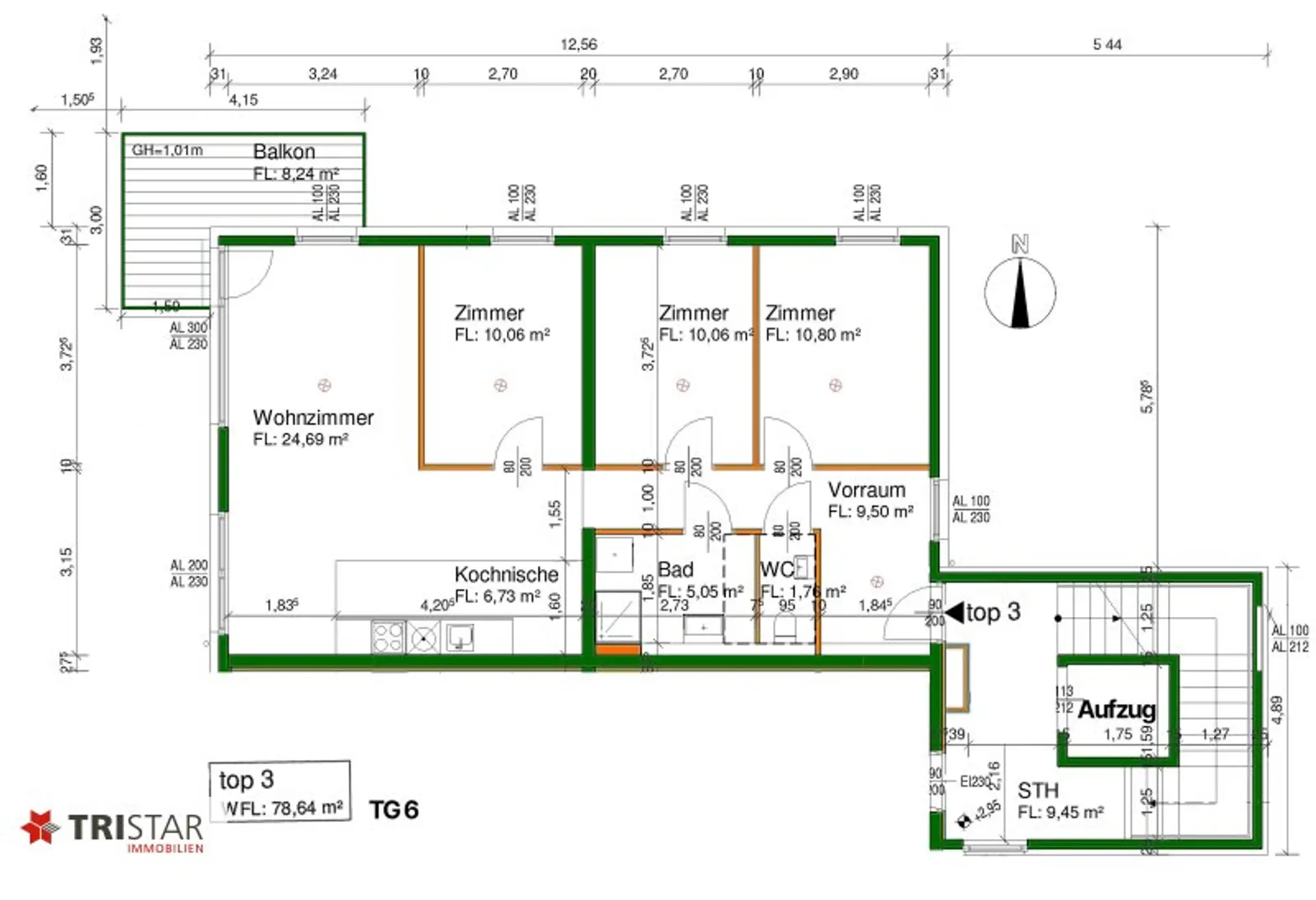 TOP T6.3: ca. 79 m² (4 Zimmer) Balkon ca. 8,24 m² - 1. Liftstock