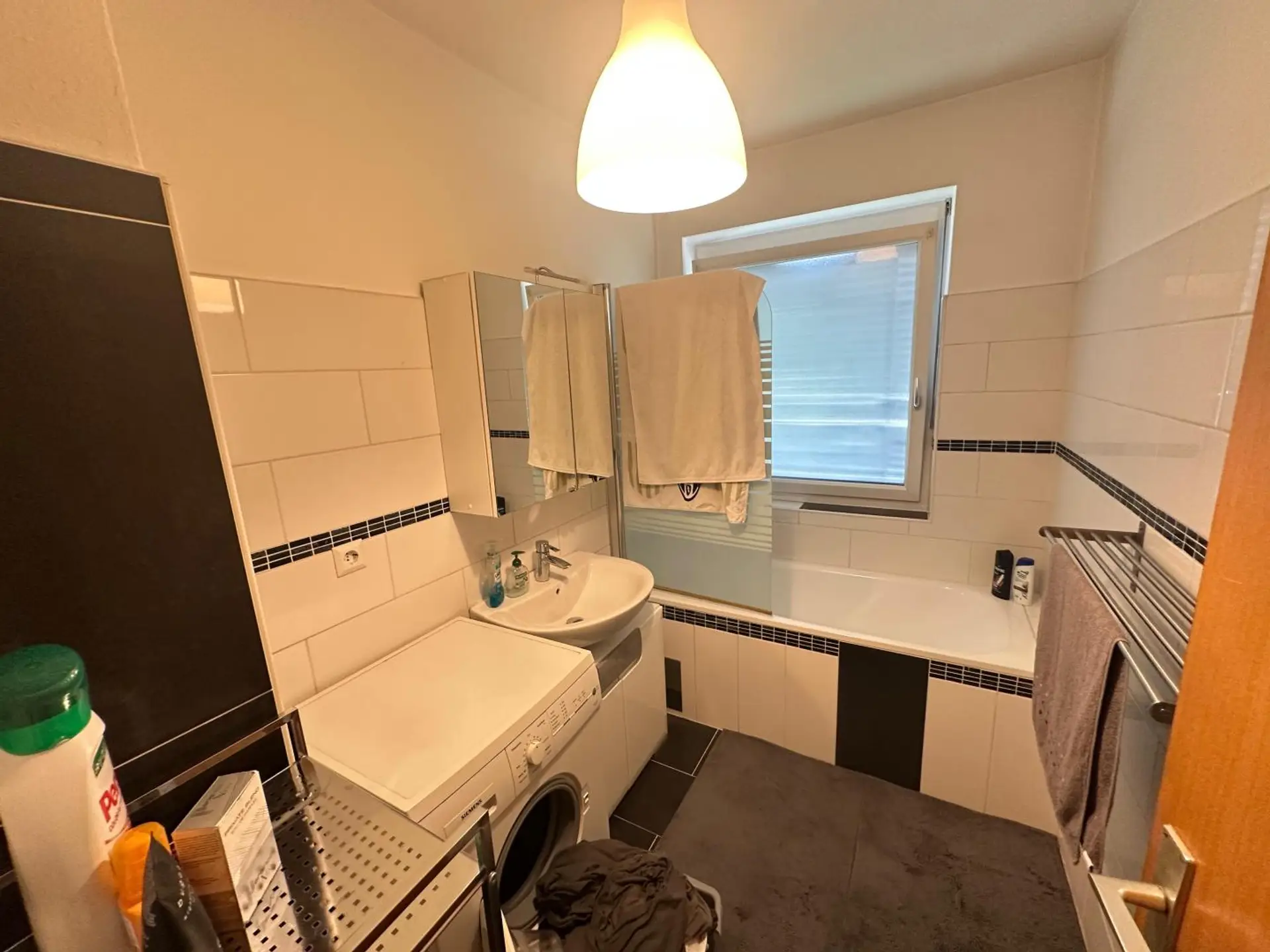 Die Wohnung verfügt über ein Badezimmer mit Badewanne und Fenster, ein separates WC sowie einen praktischen Abstellraum.