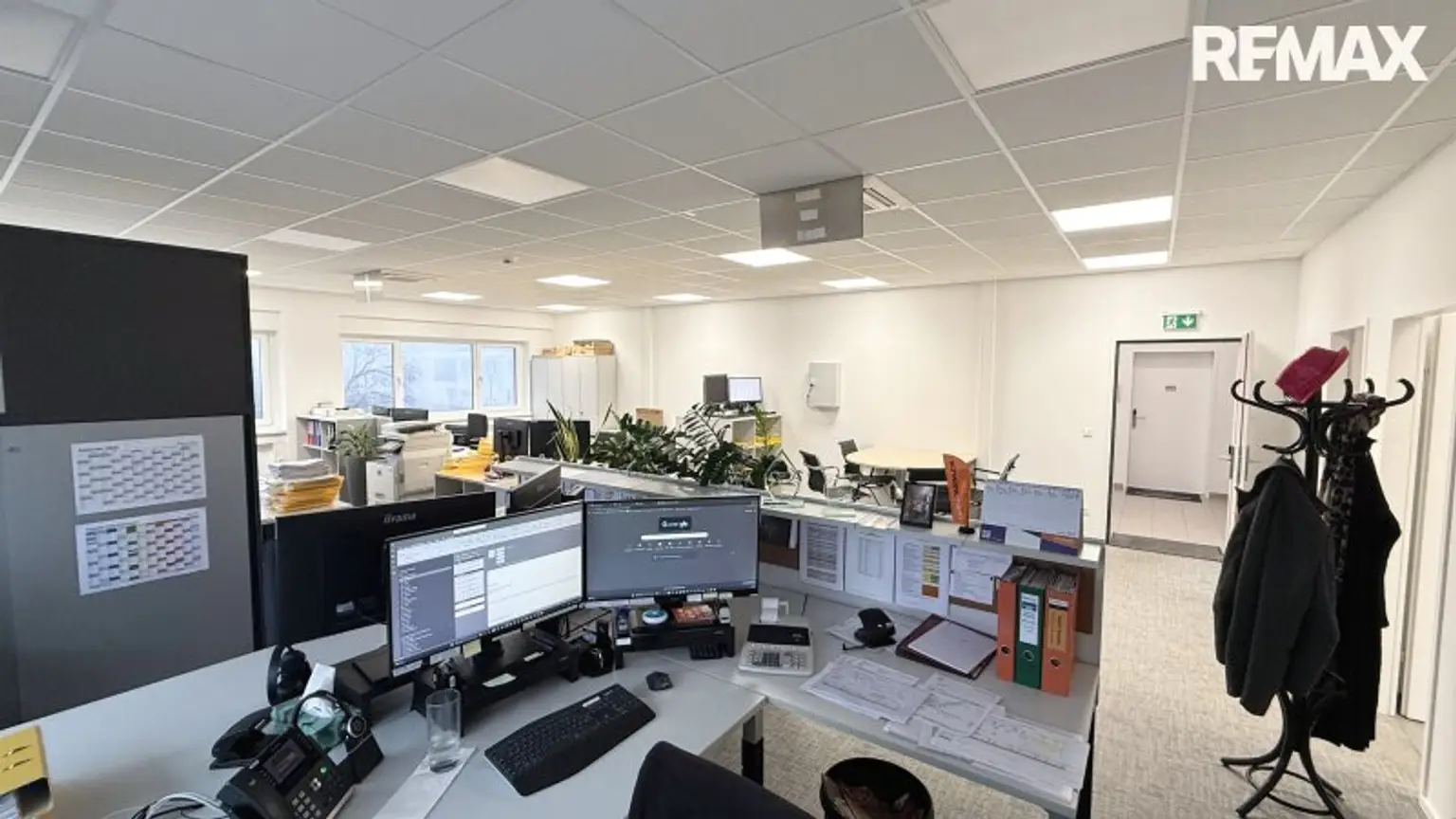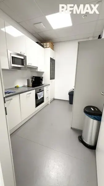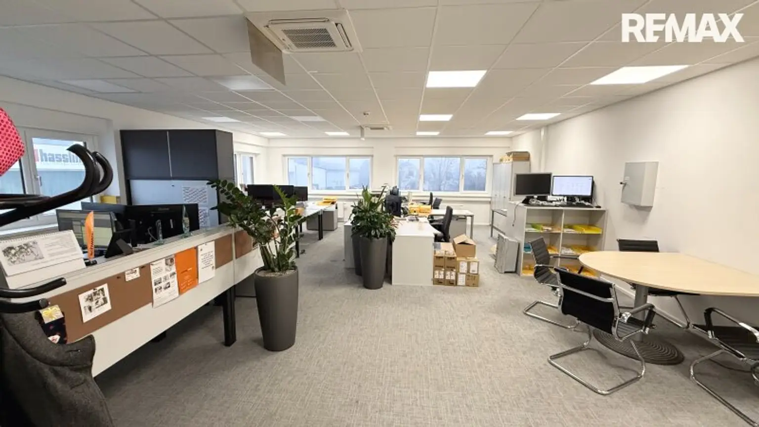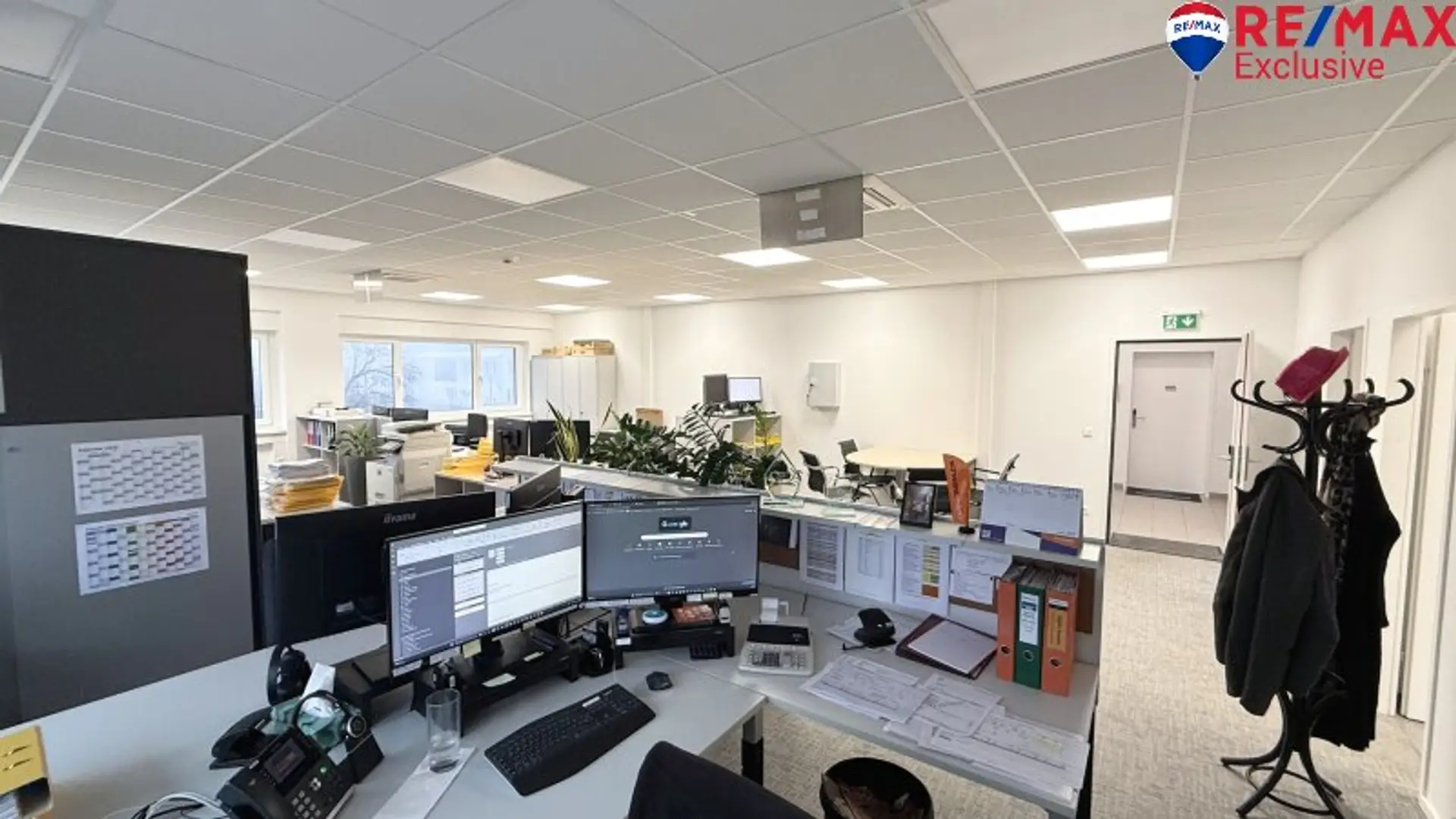 Das Büro im 1. OG verfügt über ca. 100 m² sowie einer Einbauküche.