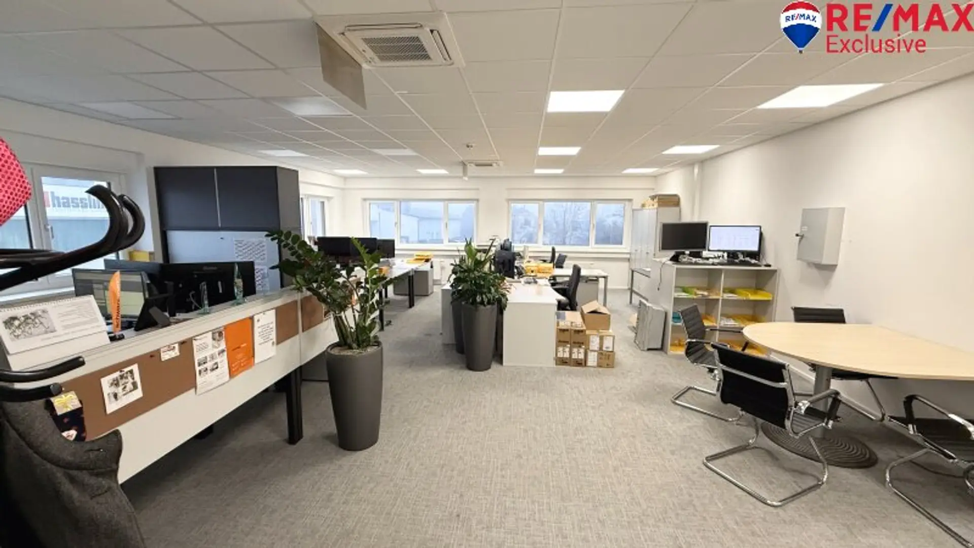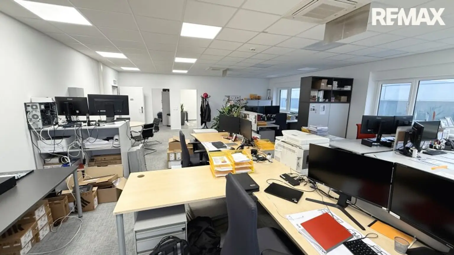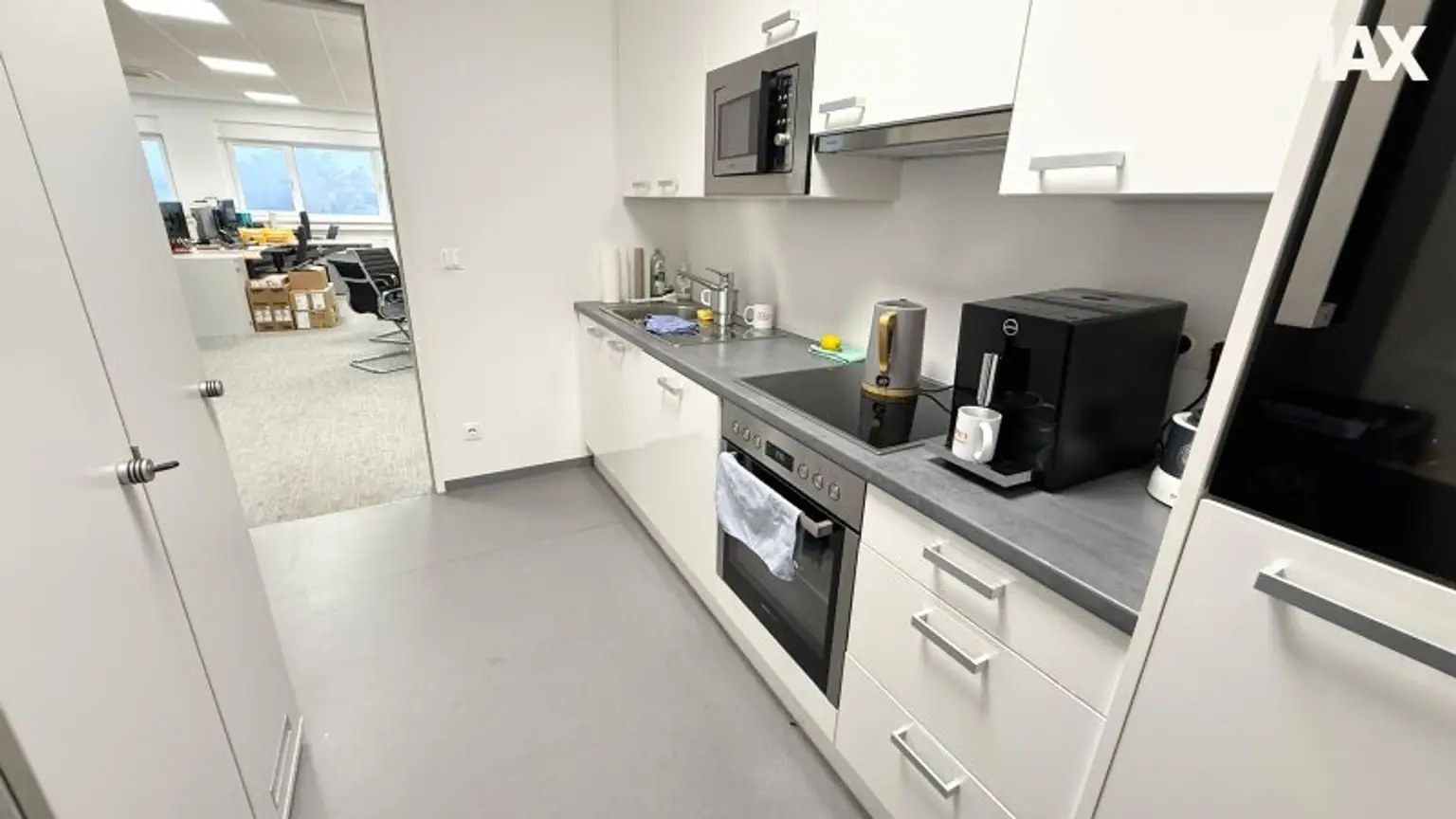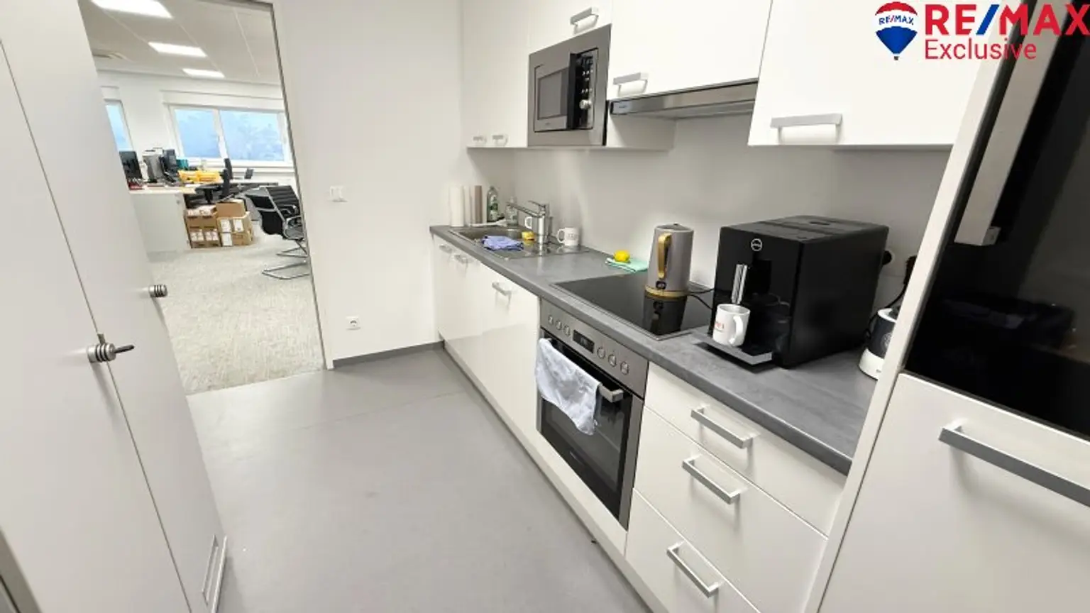 Das Büro im 1. OG verfügt über ca. 100 m² sowie einer Einbauküche.