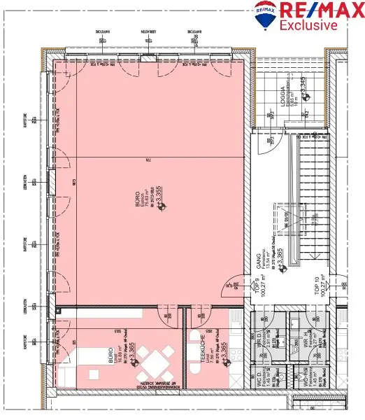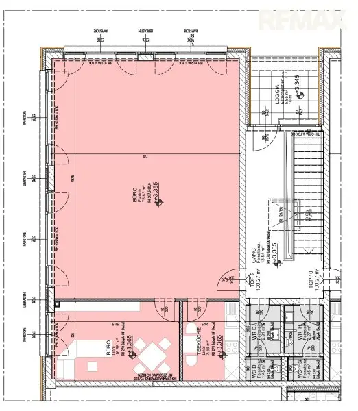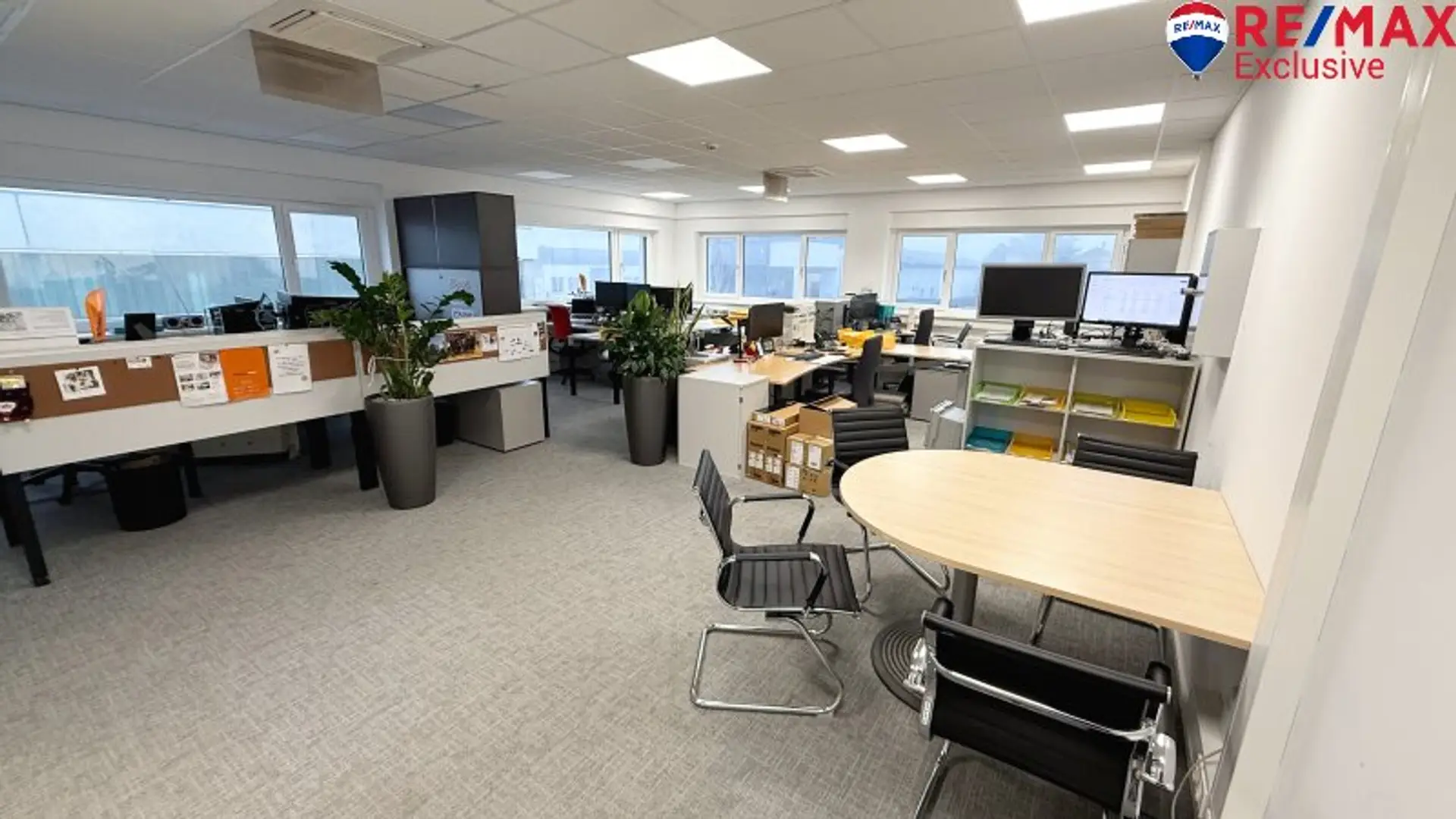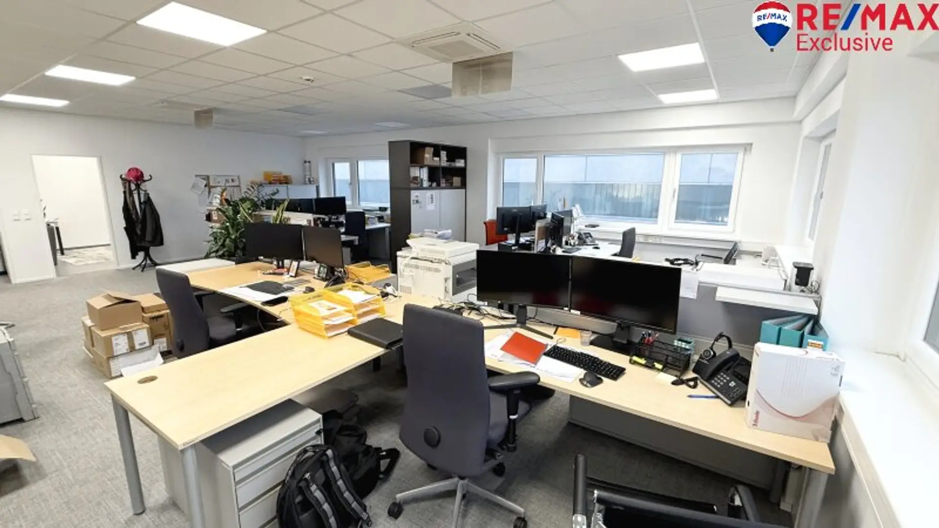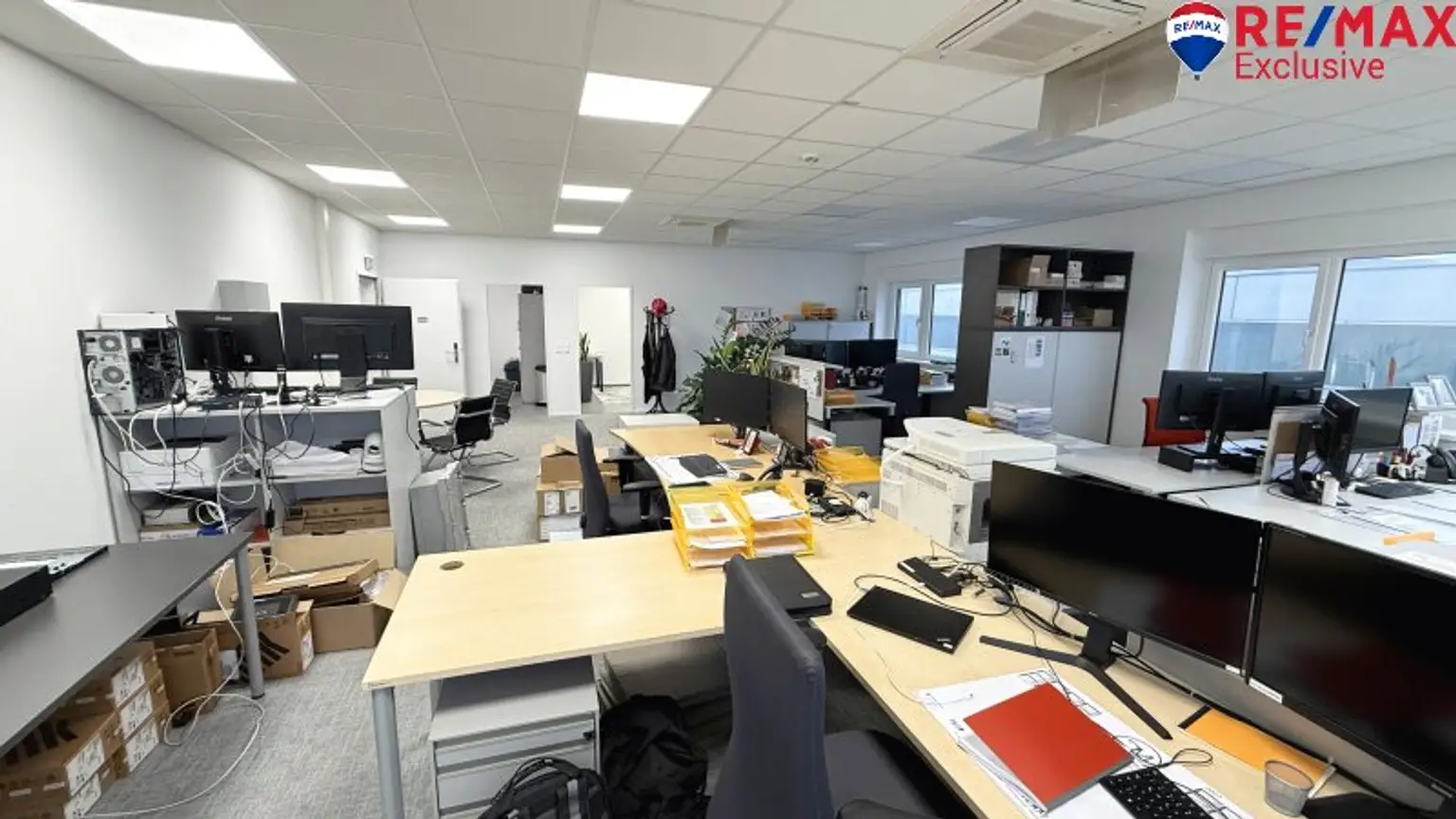 Das Büro im 1. OG verfügt über ca. 100 m² sowie einer Einbauküche.