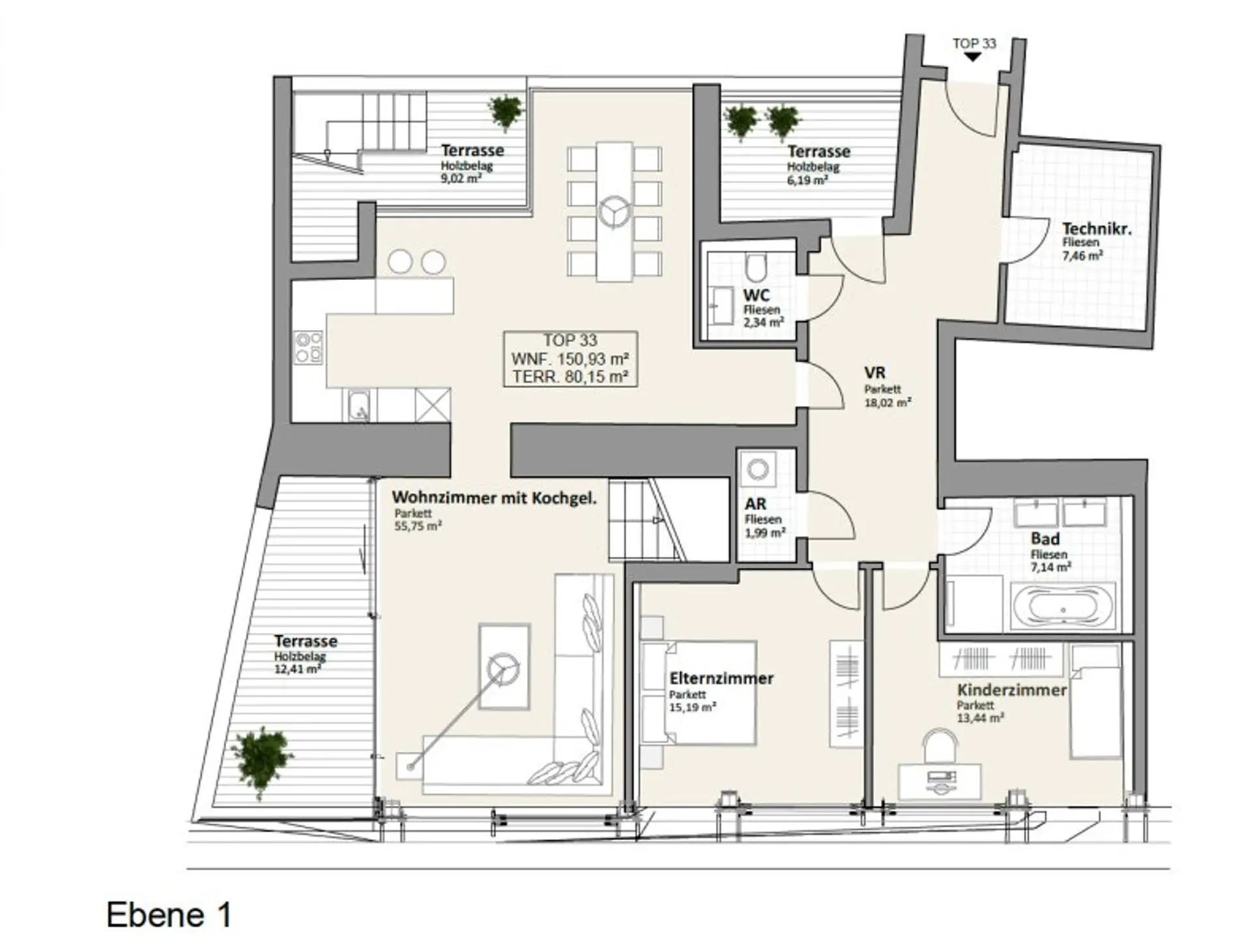 * Terrassen gesamt: 80,15 m² (3 Terrassen auf Ebene 1 und eine sehr großzügige Dachterrasse mit Blick über ganz Wien)