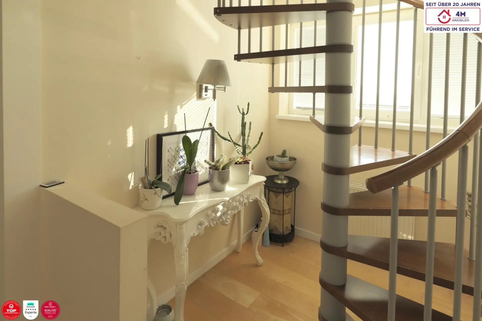 Die beiden großzügigen Ebenen bilden eine zusammenhängende, über zwei Geschosse verlaufende Wohnwelt mit separaten Eingängen und einer stilvollen Wendeltreppe als verbindendem Element. Perfekt für anspruchsvolles Familienleben, Wohnen mit Repräsentationsanspruch oder die Kombination aus Wohnen und Arbeiten.