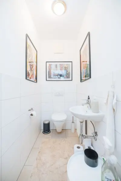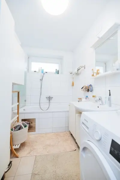 Das Badezimmer ist zeitlos modern gefliest und verfügt über eine Badewanne, ein Waschbecken, ein Fenster sowie einen Waschmaschinenanschluss. Die Toilette ist separat angelegt und mit einem praktischen Handwaschbecken ausgestattet.