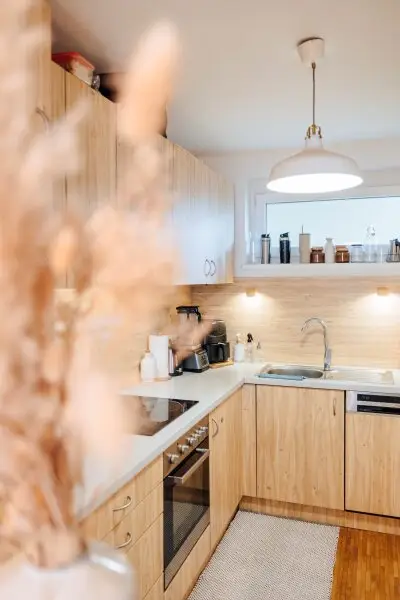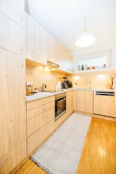 Die voll ausgestattete Einbauküche in Holzoptik bietet Ceranfeld, Backrohr, Geschirrspüler, Kühlschrank, Dunstabzug, Spülbecken, viel Stauraum und eine Durchreiche direkt zum Essbereich.