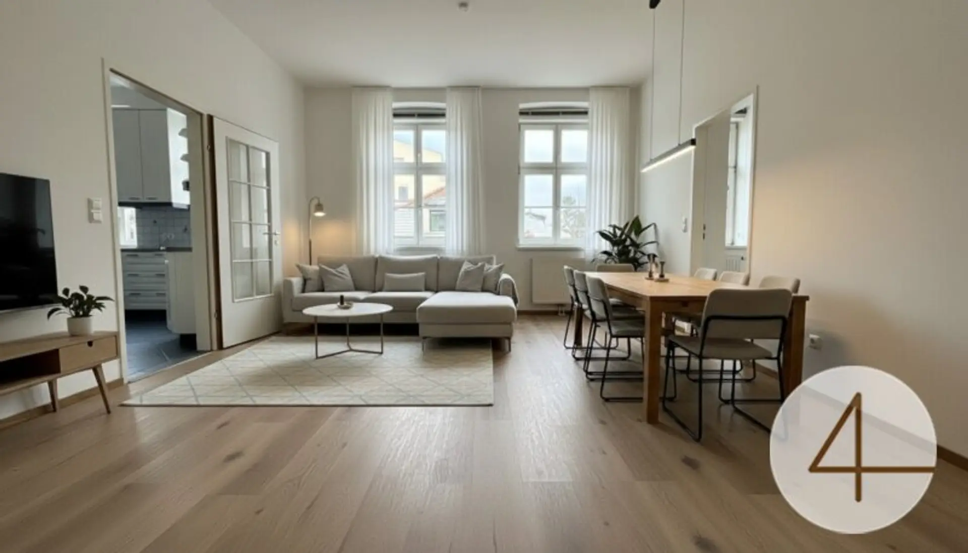 Die lichtdurchfluteten Räume und der großzügige Schnitt machen diese Wohnung zur idealen Wahl für eine große Familie, Studenten oder als Wohnung mit Home-Office.