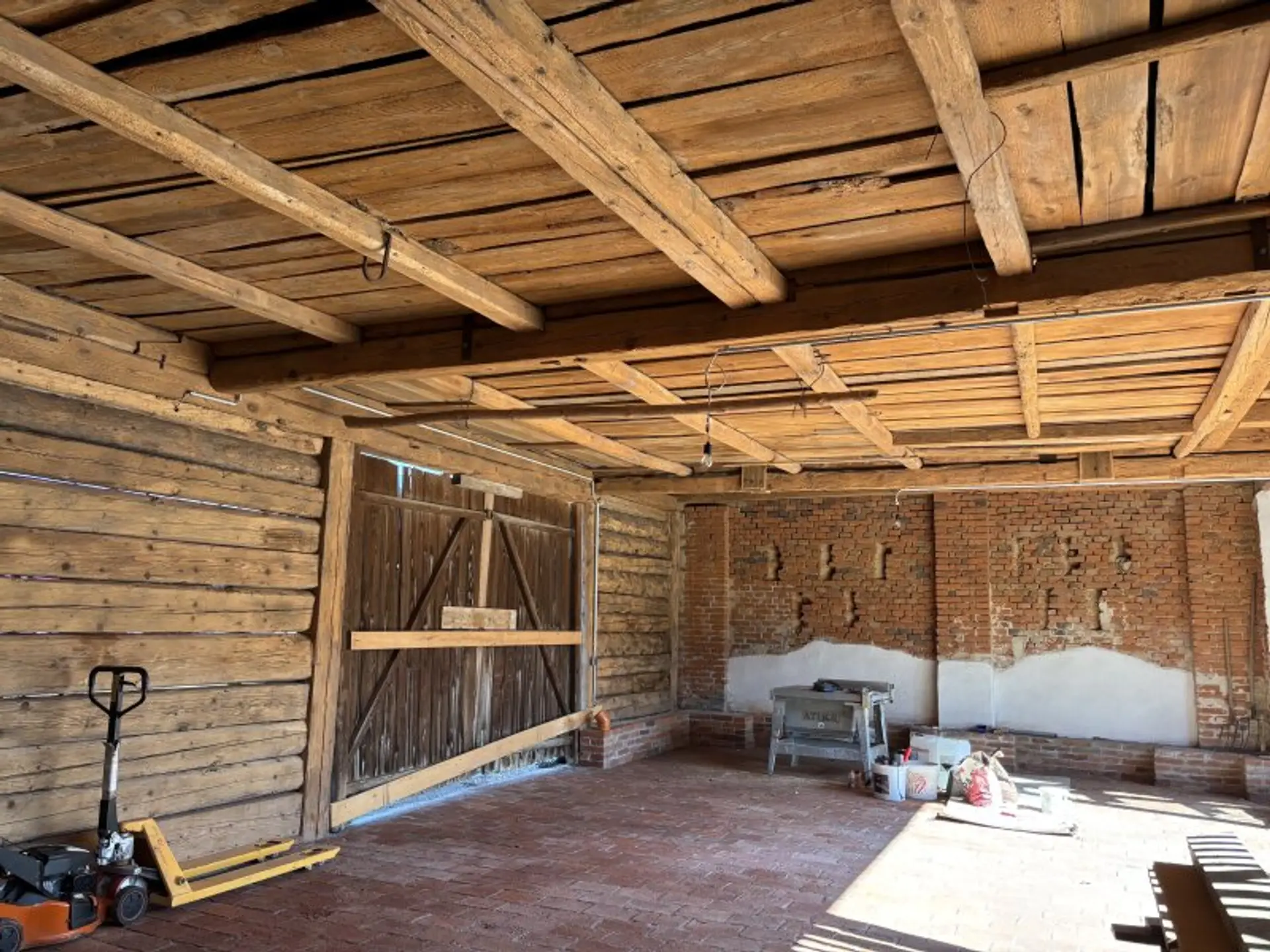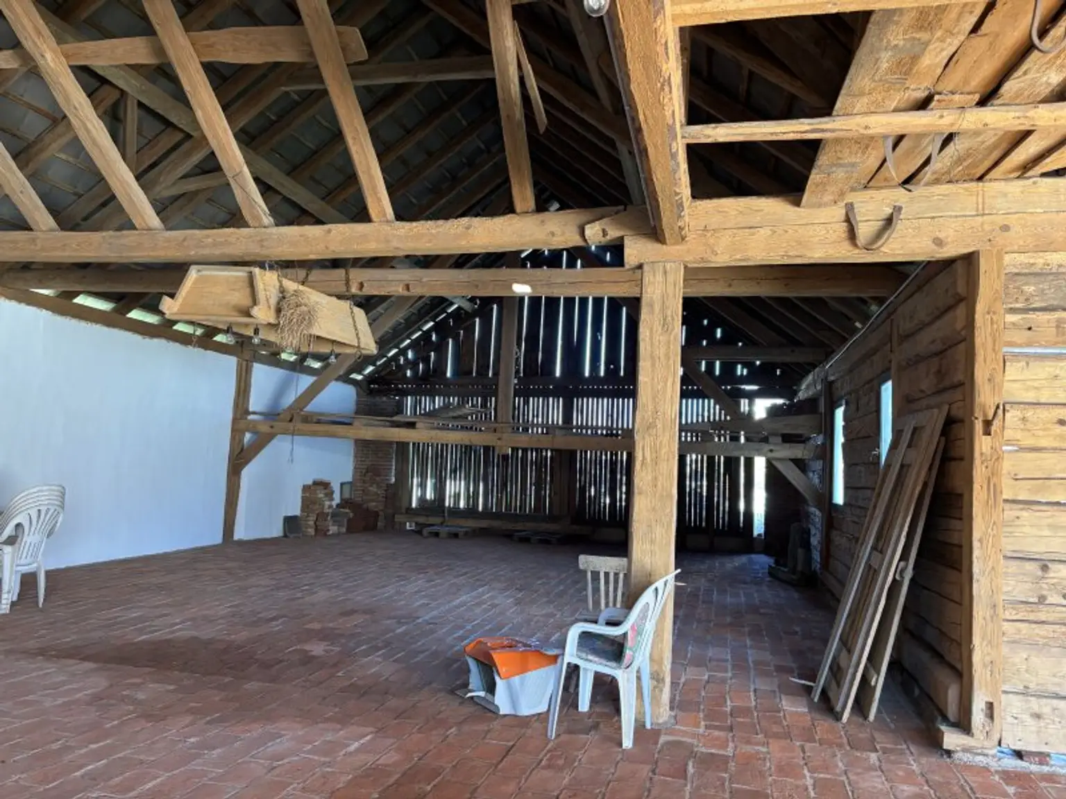 Durch den weiten , sonnigen Innenhof kann man den aussergewöhnlichen Stadel mit Autos oder auch anderen Fahrzeugen befahren. Hier wurden alte Ziegel als Boden verlegt und die Höhe des Stadels und die besondere Größe bieten sich sowohl als Lagerraum, Oldtimerplatz, Werkstatt oder Atelier an.