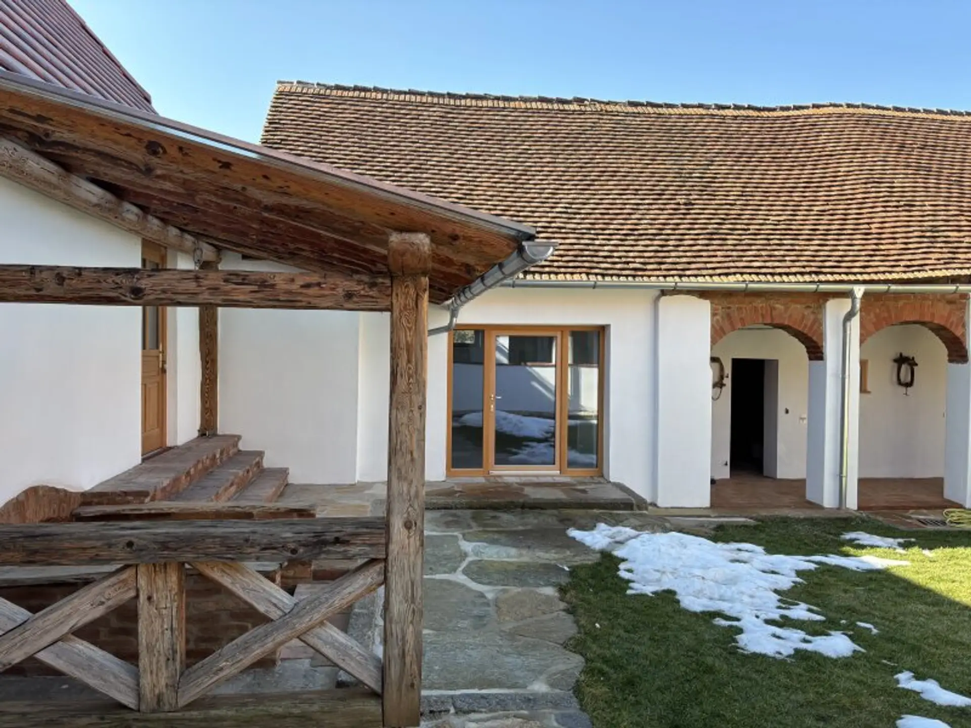 Man betritt den Hof durch ein 2-Flügeliges altes Tor, rechts befindet sich der Wohnbereich mit dem verglasten Arkadengang. Es wurde auf Modernität und zugleich auch auf Authentzität im Wohnbereich Wert gelegt. Alle Leitungen wurden neu gemacht, die Luftwärmepumpe und die Fußbodenheizung entsprechen der heutigen modernen Zeit. Es stehen 3 Schlafzimmer, 1 Wohnzimmer mit Holztramdecke , 1 Wohnküche mit großer Speis und 1 Bad/ Wc zur Verfügung.