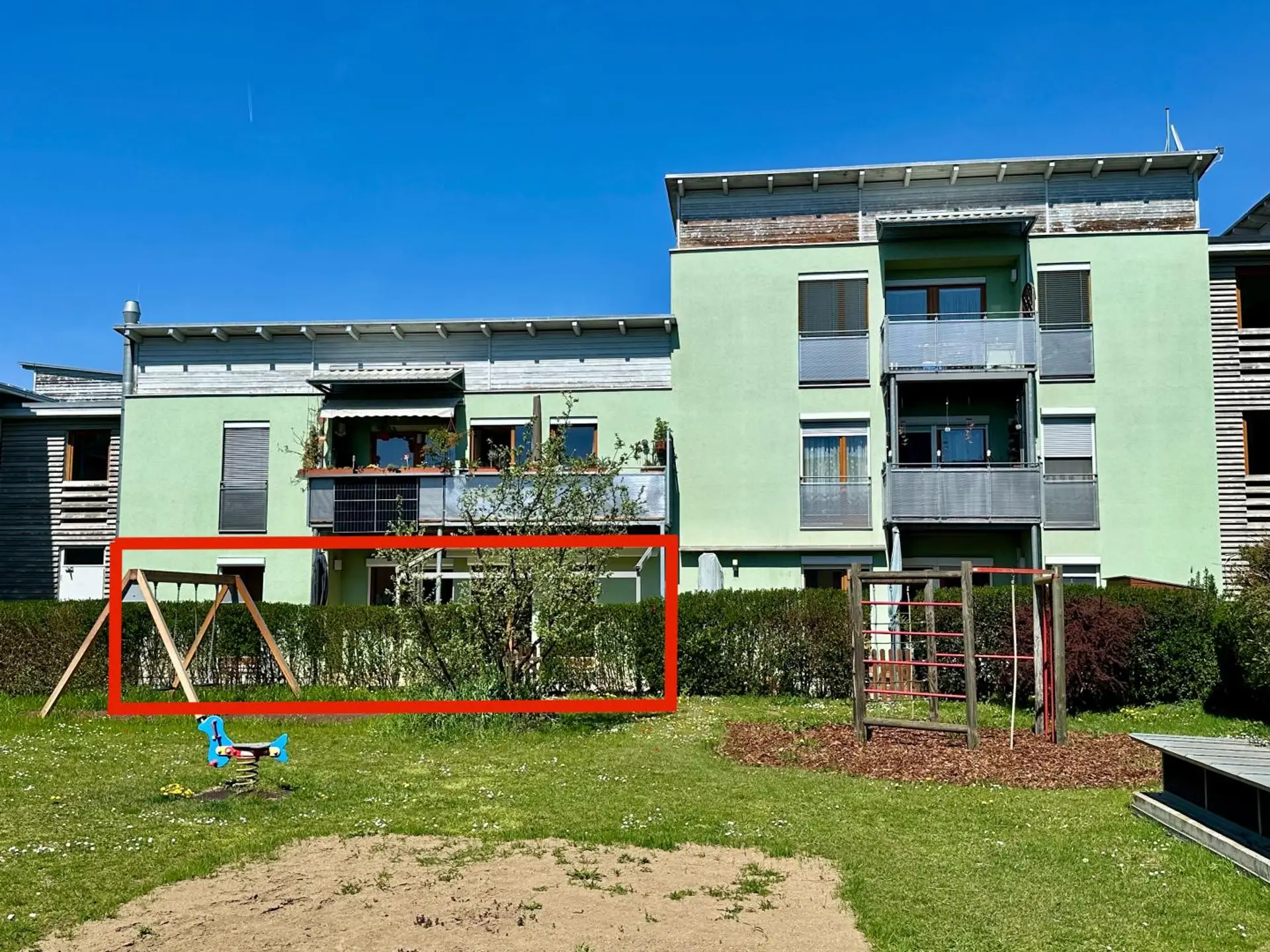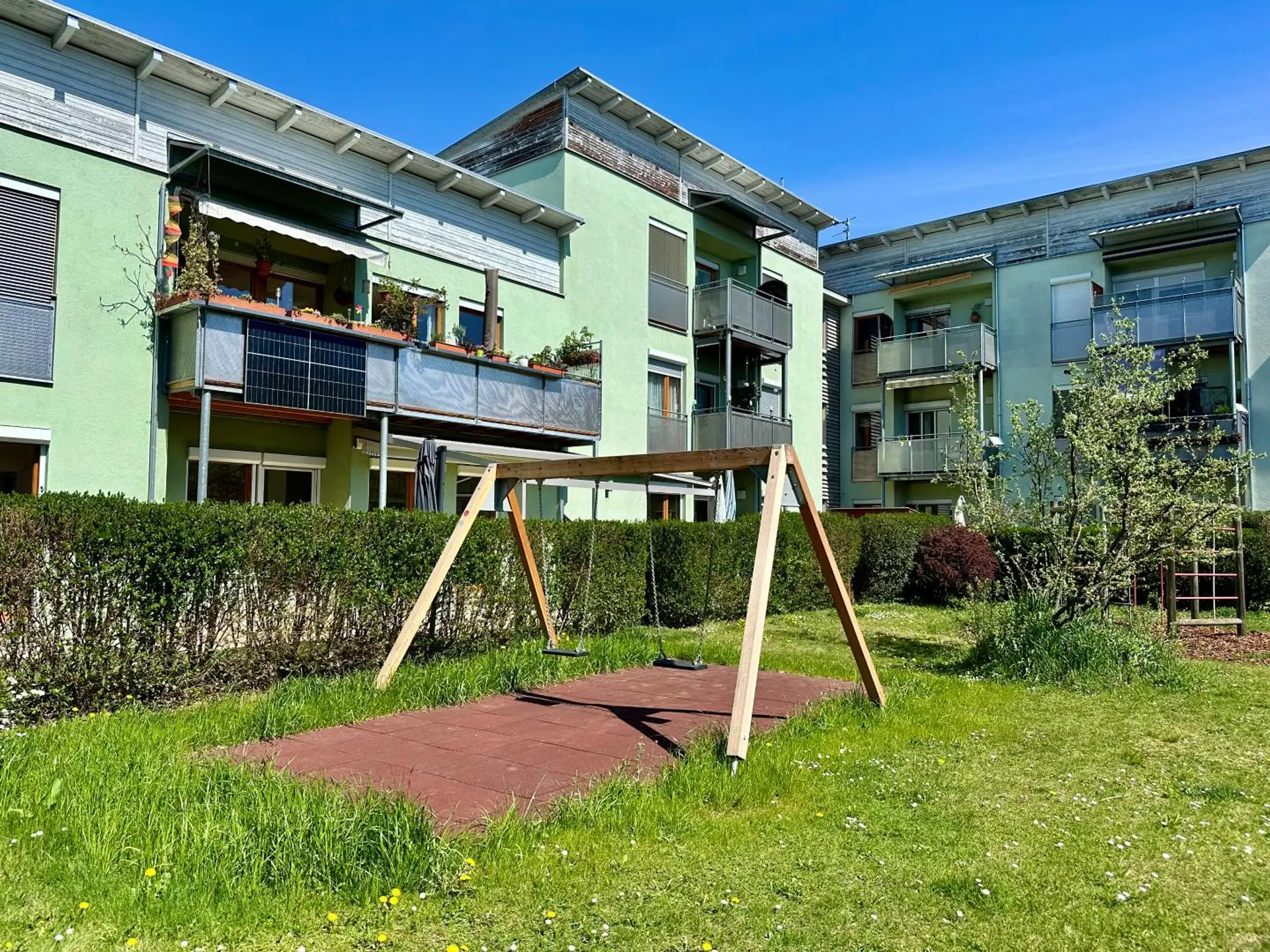 Die Außenanlage bietet neben den allgemeinen Grünflächen, Kinderspielplätze und Besucher-Parkplätze.