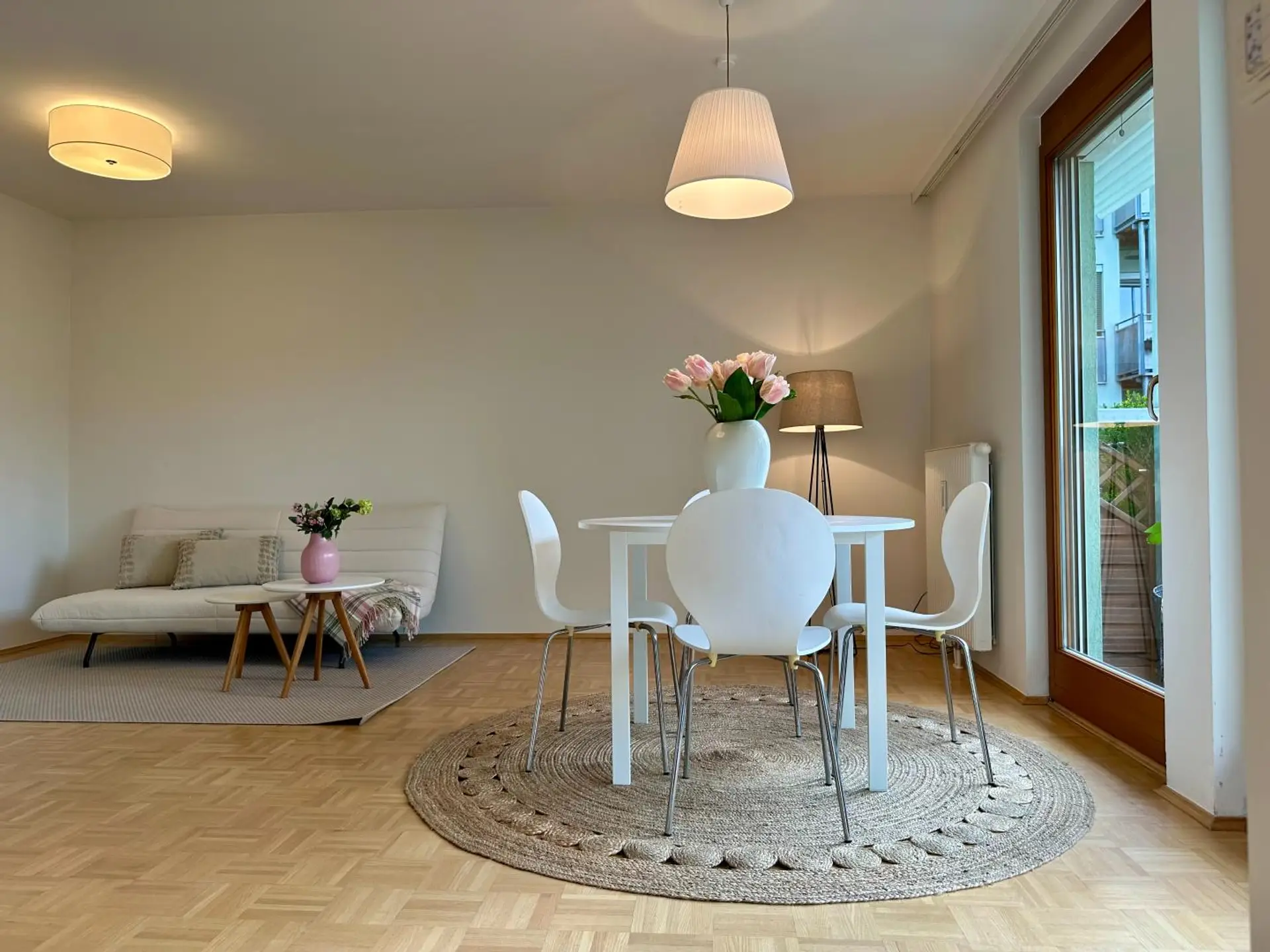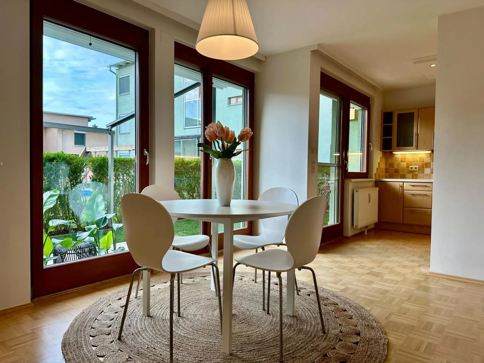 Der lichtdurchflutete Wohn-Ess-Kochbereich besticht durch seine Großzügigkeit und den direkten Zugang auf die Terrasse und in den Garten.