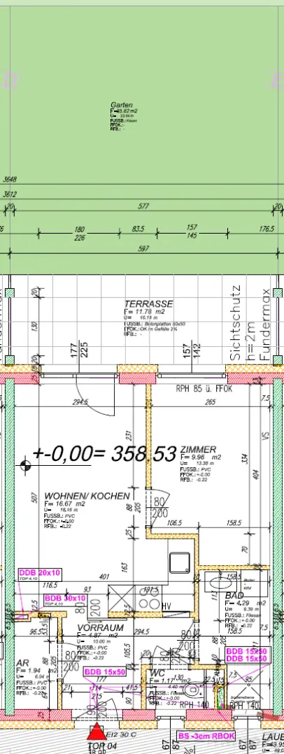 Eigengarten (35,32 m²) und Terrasse (11,78 m²) können von Wohn-/Esszimmer + Küche erreicht werden. Weiters ist der Wohnung ein geräumiges Kellerabteil sowie ein KFZ-Abstellplatz zugeteilt.