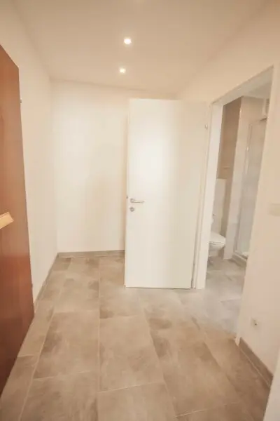Der Vorraum verfügt hinter der Eingangstür über einen praktischen, großzügigen, abtrennbaren Abstellbereich sowie einen Waschmaschinenanschluss. Geradeaus geht es in der Badezimmer, welches einen geschmackvollen Waschtisch, eine verglaste Dusche, ein WC und einen Handtuchheizkörper bietet.