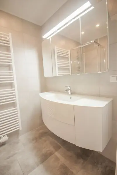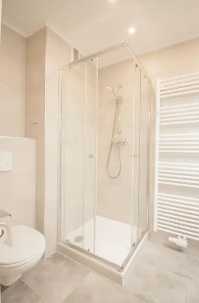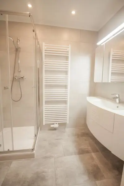* Badezimmer mit WC, Waschtisch, Handtuchheizkörper & Dusche