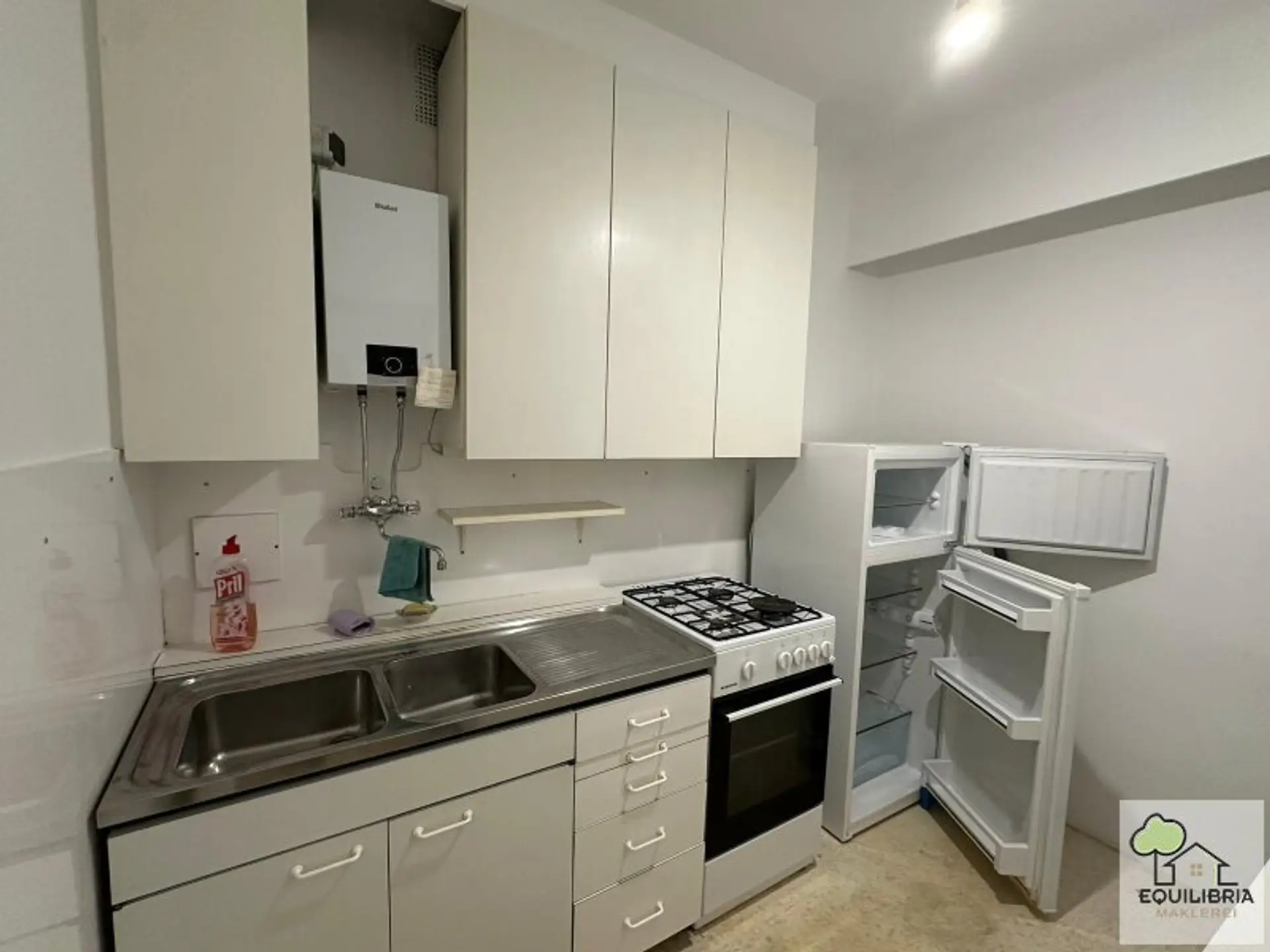 Die Küche ist mit einem Herd und einem Kühlschrank ausgestattet.