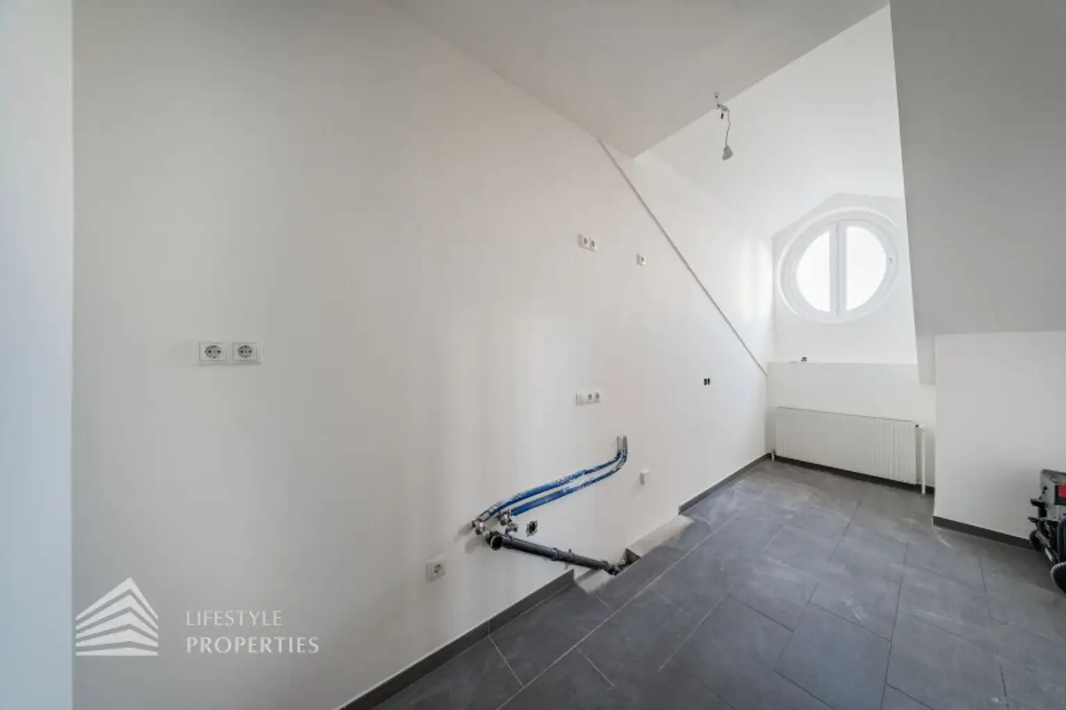 Sie betreten die Wohnung und befinden sich im Entrée. Gleich rechts gelangen Sie in den großen und hellen Salon, der genügend Platz für einen großen Esstisch und eine gemütliche Sitzecke bietet. Vom Wohnraum gelangend Sie in die Küche, wo man durch eine kleine Trennwand auch sehr gut eine Speis bzw. einen Abstellraum einplanen könnte. Vom Wohnraum gelangen Sie über eine Treppe zu einem Vorraum der Sie in das große Schlafzimmer mit wunderschönem Ausblick führt. Außerdem befindet sich hier das Bad, welches mit einer Badewanne, einem Waschbecken und einem WC ausgestattet ist.