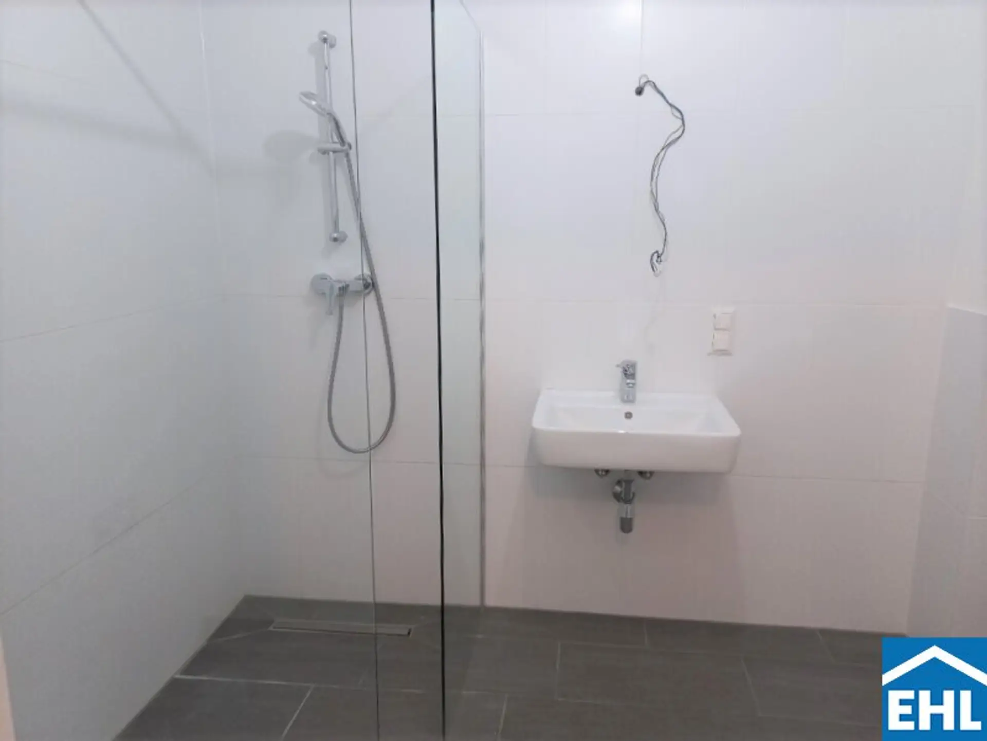 * Badezimmer mit Dusche, WC und Waschmaschinenanschluss