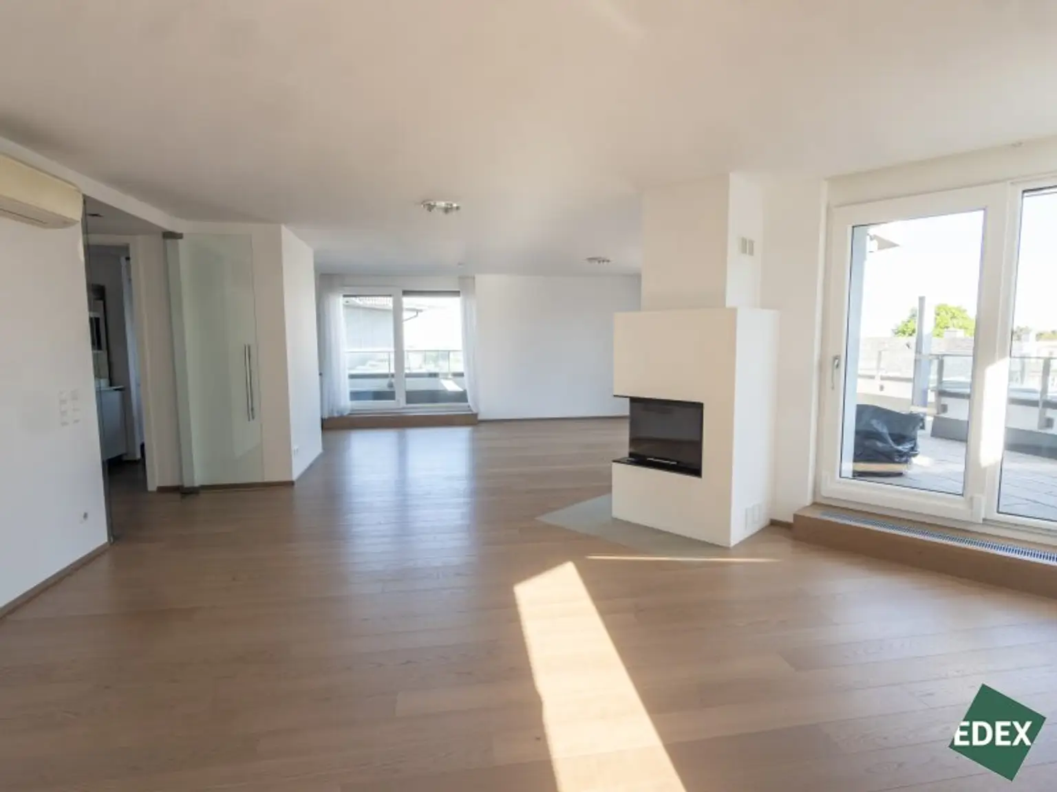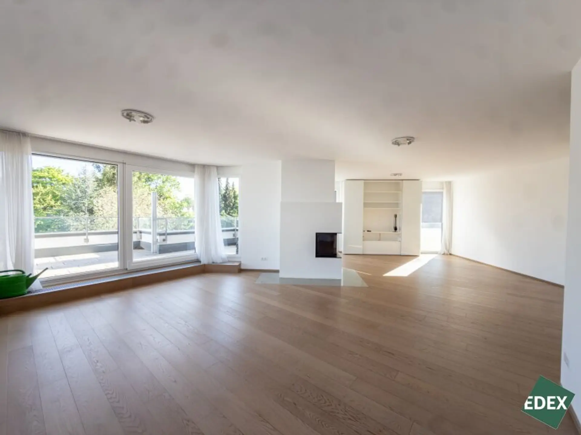Das Herzstück der Wohnung ist der beeindruckende, rund 66 m² große Wohnbereich, der durch seine offene Gestaltung, große Fensterflächen und den offenen Kamin ein einzigartiges Wohngefühl vermittelt. Von hier aus gelangt man auf eine weitläufige Terrasse, die zusätzlichen Freiraum im Grünen bietet.