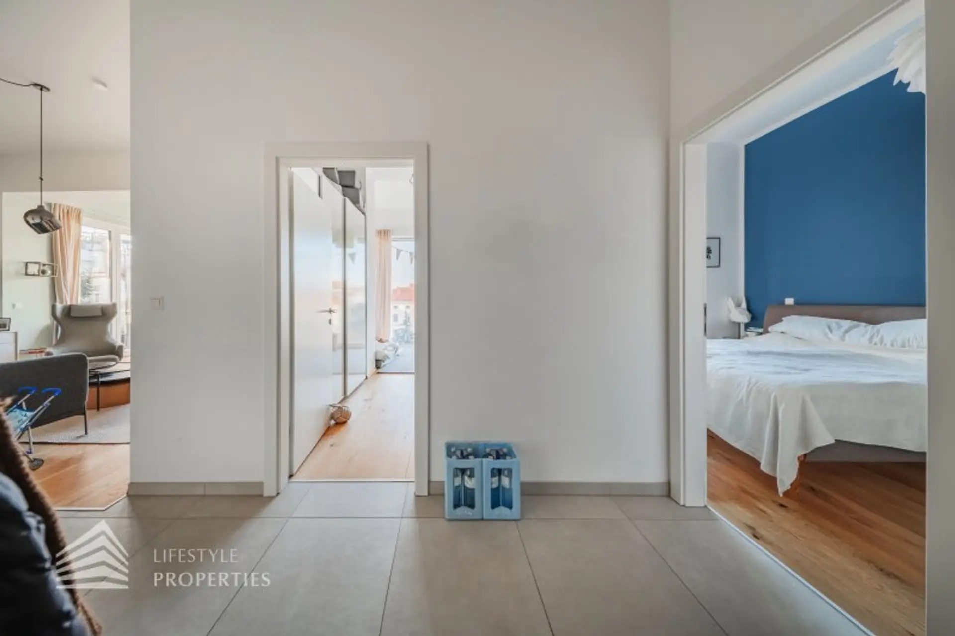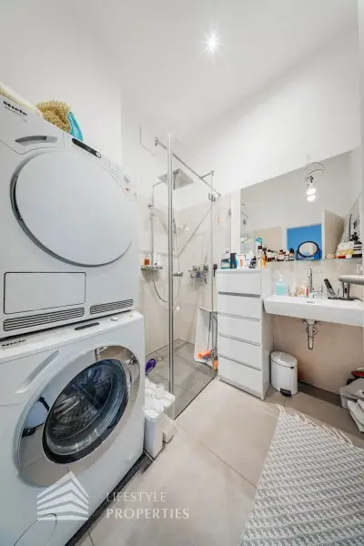 Sie betreten die Wohnung und befinden sich im Vorraum. Über diesen gelangen Sie in die lichtdurchflutete große Wohnküche. Diese kann räumlich ideal in einen Küchen- und einen Wohnbereich unterteilt werden und bietet ausreichend Platz für eine Couchlandschaft sowie einen großen Esstisch. Die Küche ist mit den modernsten und hochwertigsten Küchengeräten von der Marke Zanussi ausgestattet. Über die Wohnküche gelangen Sie auf den schönen Balkon. Die beiden Schlafzimmer sind gleich groß. Das Badezimmer ist mit einer Dusche, einem Waschbecken und einem Waschmaschinenanschluss ausgestattet. Die Gästetoilette befindet sich direkt neben dem Badezimmer.