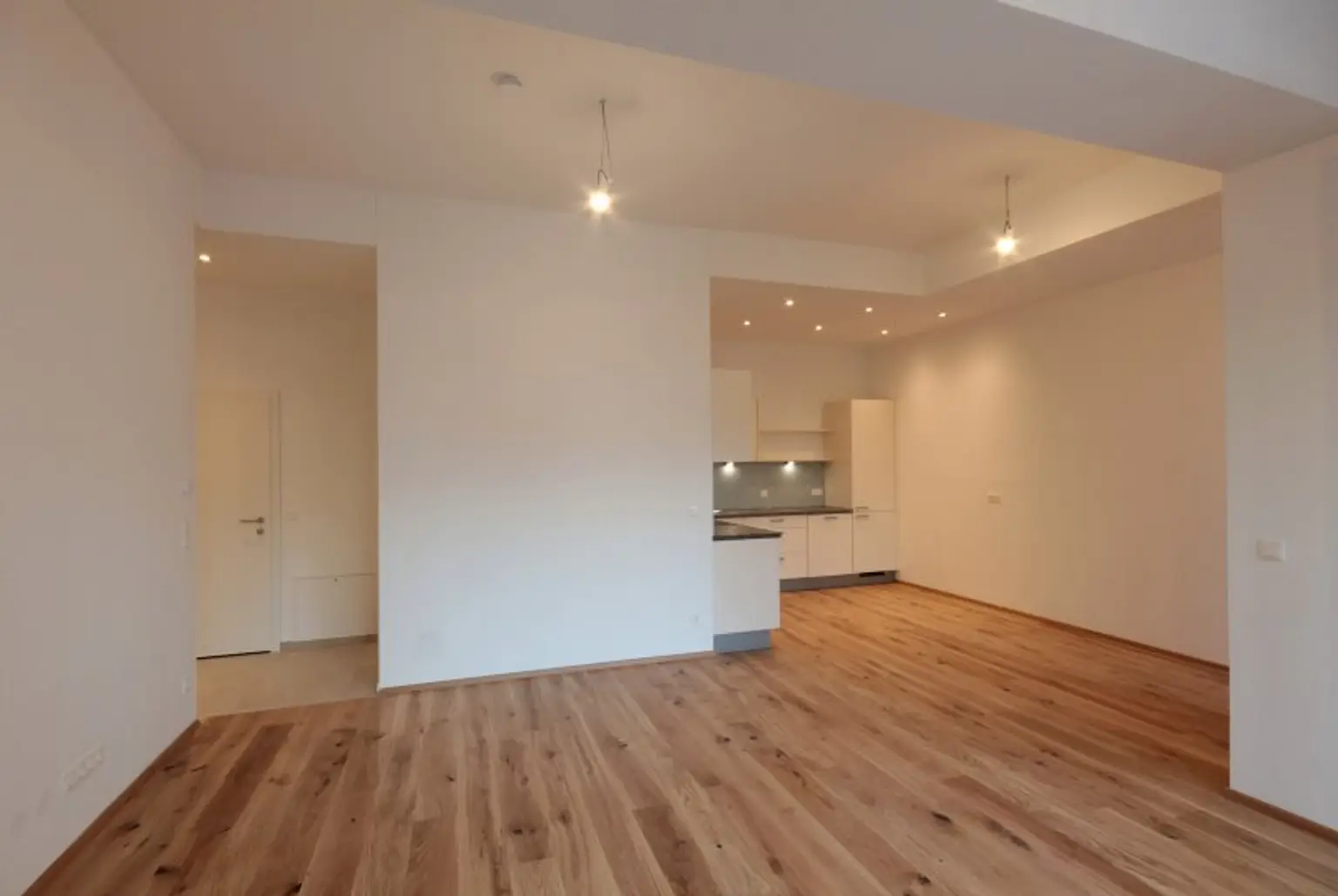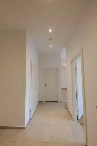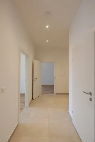 Sie betreten die Wohnung und befinden sich im Vorraum. Über diesen gelangen Sie in die lichtdurchflutete ca. 36 m² große Wohnküche. Diese kann räumlich ideal in einen Küchen- und einen Wohnbereich unterteilt werden und bietet ausreichend Platz für eine Couchlandschaft sowie einen großen Esstisch. Die Küche ist mit den modernsten und hochwertigsten Küchengeräten von der Marke Zanussi ausgestattet. Über die Wohnküche gelangen Sie auf den schönen Balkon. Die beiden Schlafzimmer sind gleich groß. Das Badezimmer ist mit einer Dusche, einem Waschbecken und einem Waschmaschinenanschluss ausgestattet. Die Gästetoilette befindet sich direkt neben dem Badezimmer.