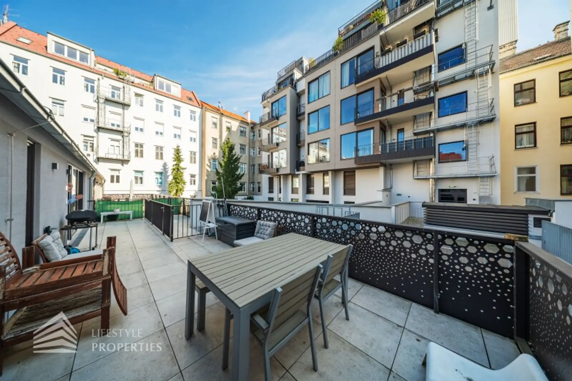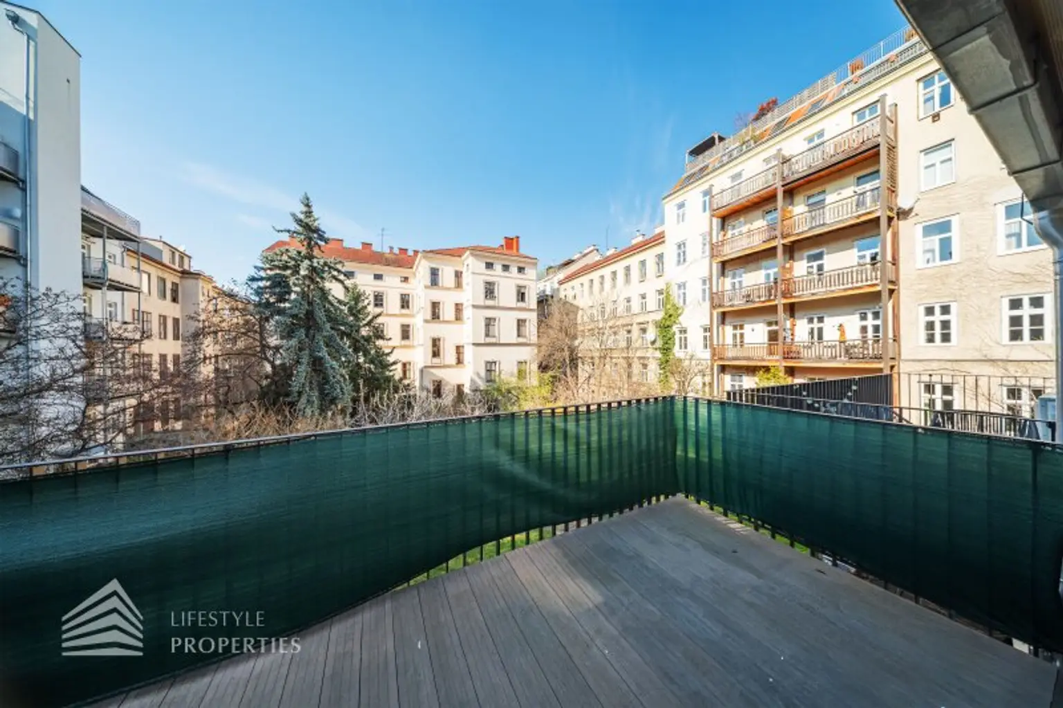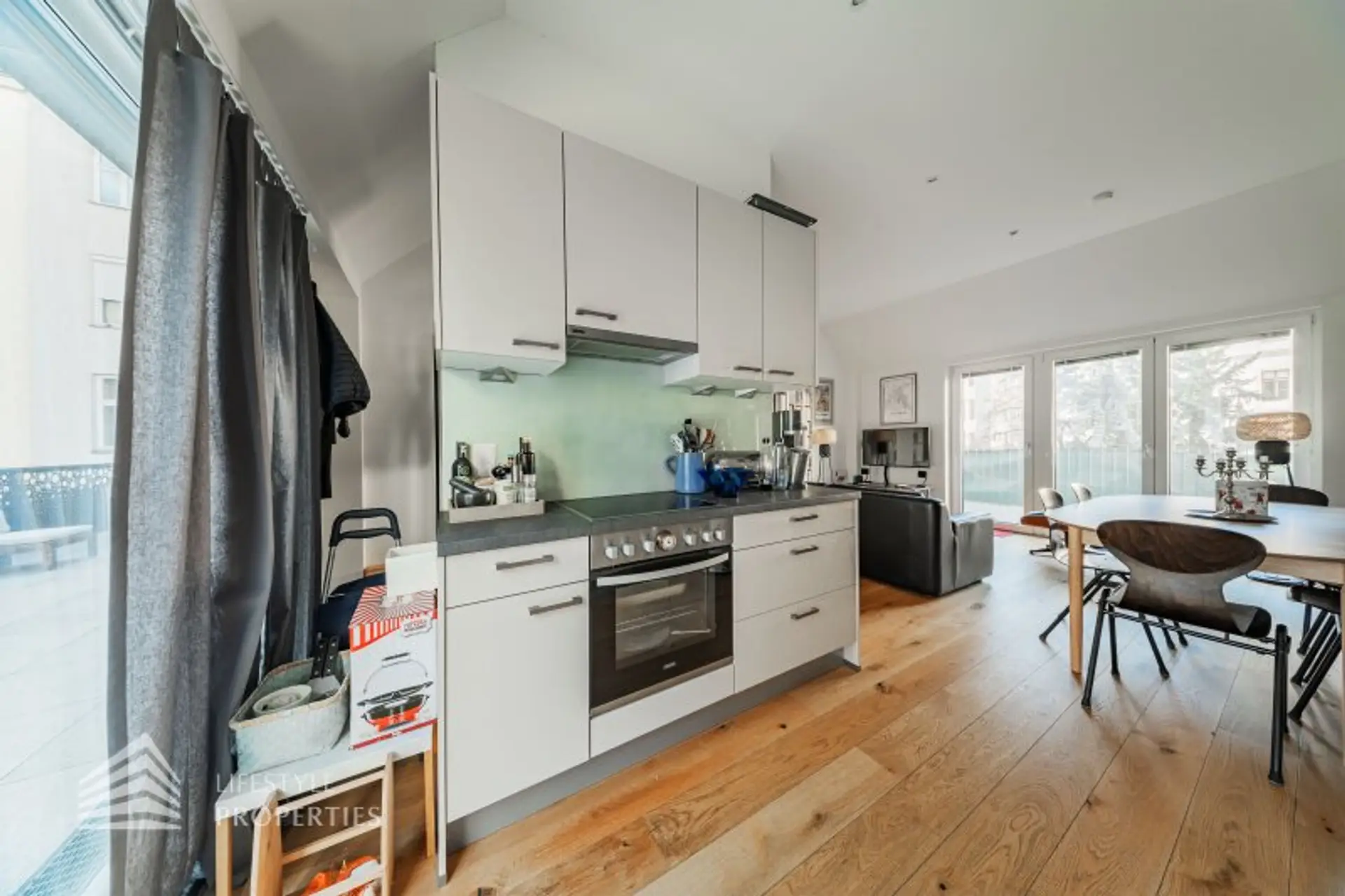 Die Immobilie befindet sich im Dachgeschoss im Innenhofgebäude eines im Jahre 1971 erbauten, gepflegten Hauses und erstreckt sich über eine Wohnfläche von ca. 83 m². Die Wohnung teilt sich in eine große Wohnküche, drei Zimmer, einen Balkon, eine Terrasse, ein Badezimmer, einen Vorraum, und eine separate Toilette auf. Die Haupträume sind mit einem hochwertigen Parkettboden ausgekleidet, der Vorraum sowie die Nassräume sind gefliest. Die Wohnung verfügt in allen Räumen über eine Fußbodenheizung sowie über ein eigenes Kellerabteil. Die Immobilie wird unmöbliert vermietet. Die gesamte Wohnung ist aufgrund der vielen hohen Fenster lichtdurchflutet und wirkt dadurch äußerst gemütlich und freundlich.