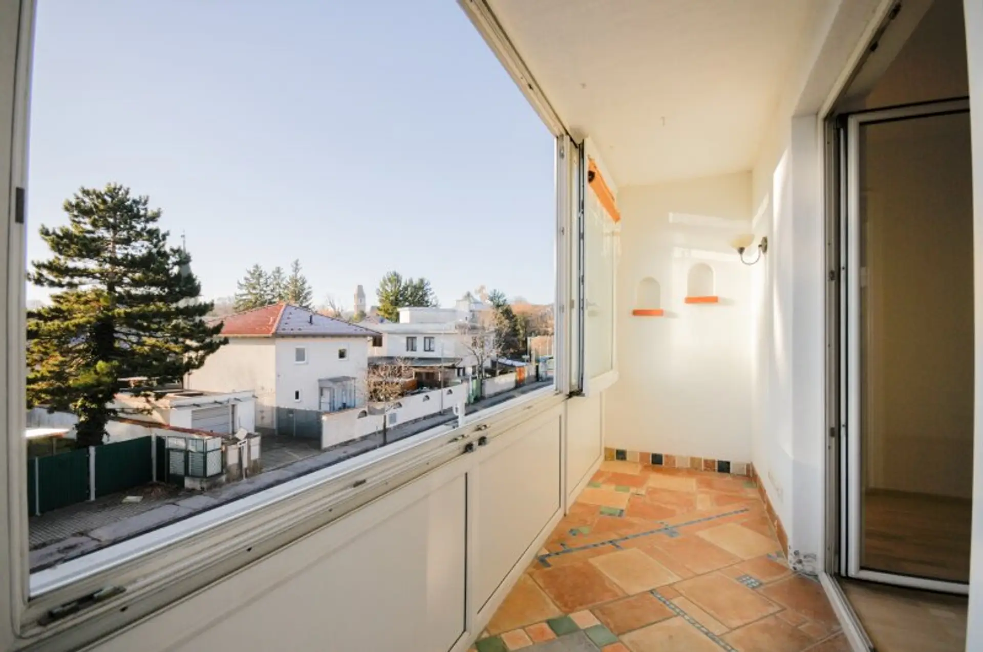 Das ausgesprochen schöne und sonnige Wohnzimmer hat eine ideale Größe von 26 m² - hier lassen sich eine gemütliche Couch und ein Essbereich gut stellen. Ein Kaminanschluss im Wohnbereich rundet das besondere Flair des Raumes ab - hier lässt sich ein Schwedenofen perfekt in Szene setzen. Die vorgelagerte 7,2 m² große Loggia in Südausrichtung ladet zu gemütlichen Abenden oder einem köstlichen Frühstück im Freien ein. Durch die komplette Verglasung der Loggia, kann sie ideal auch in den Wintermonaten genutzt werden.