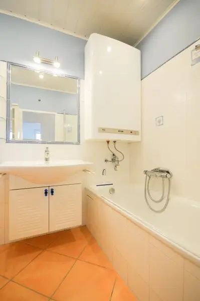 Das Badezimmer ist mit einer Badewanne, einem Waschbecken und Waschmaschinenanschluss ausgestattet. Die Toilette ist separat.