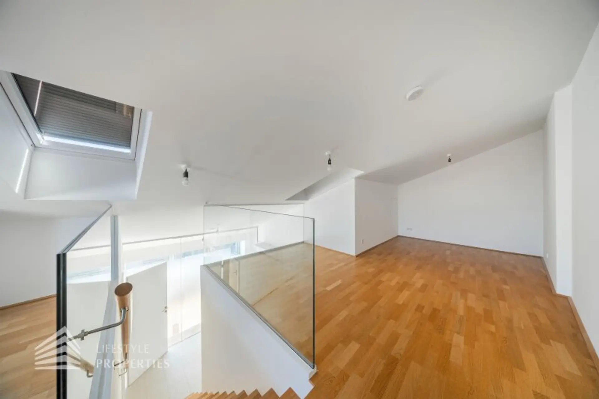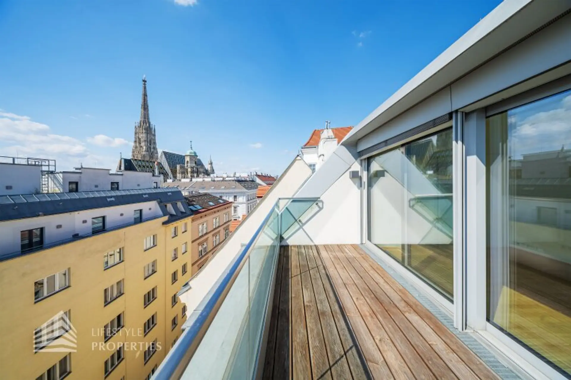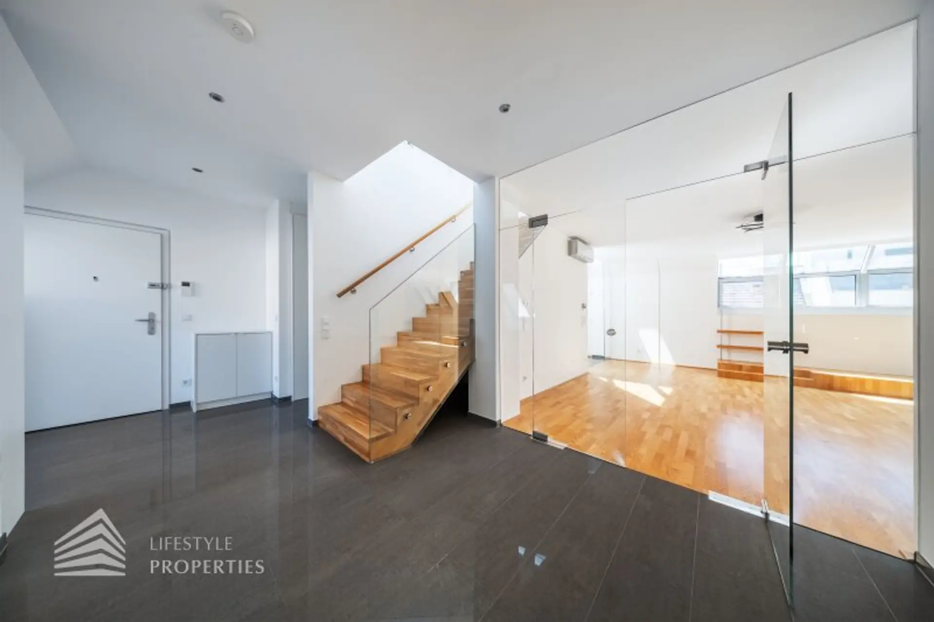 Die Maisonette gliedert sich in der unteren Ebene in ein geräumiges Entrée, einen großen Salon mit offener Küche, der genügend Platz für einen Esstisch und eine gemütliche Wohnecke bietet, die Küche ist vollständig ausgestattet. Das große Zimmer ist eine Galerie, die sich im oberen Teil befindet und im unteren Bereich mit einem Schrankraum und en-suite Bad mit Badewanne, zwei Waschbecken und WC ausgestattet ist. Ein weiteres Zimmer mit en-suite Bad sowie noch ein Zimmer, einen Abstellraum und zwei separate WCs finden Sie auf der unteren Ebene. In der oberen Ebene befindet sich eine weitere Galerie mit Zugang zu den zwei Terrassen, welche teilweise einen wunderschönen Blick auf den Stephansdom bieten. Des Weiteren gibt es im oberen Stockwerk ein weiteres Bad mit Dusche und WC.
