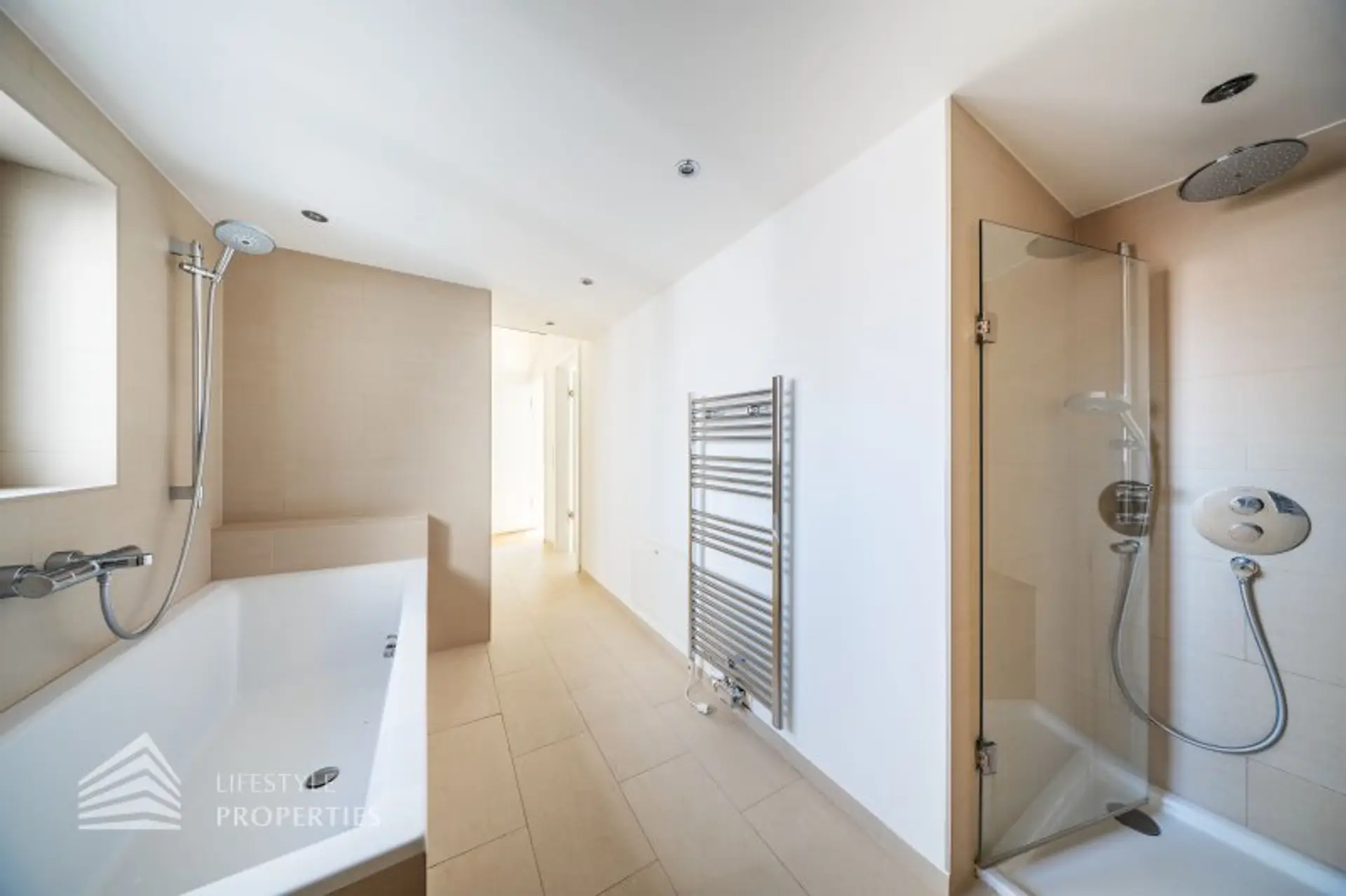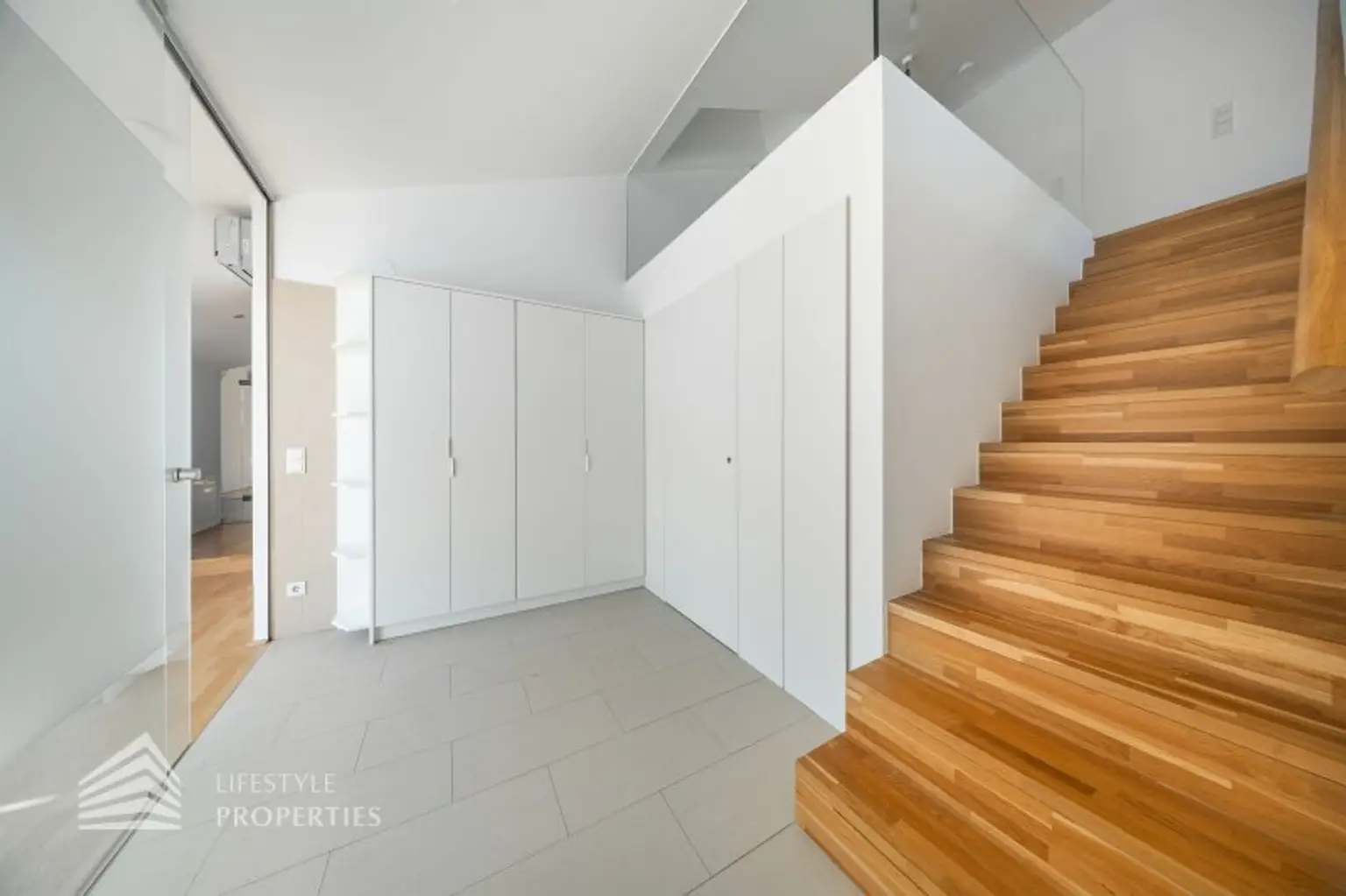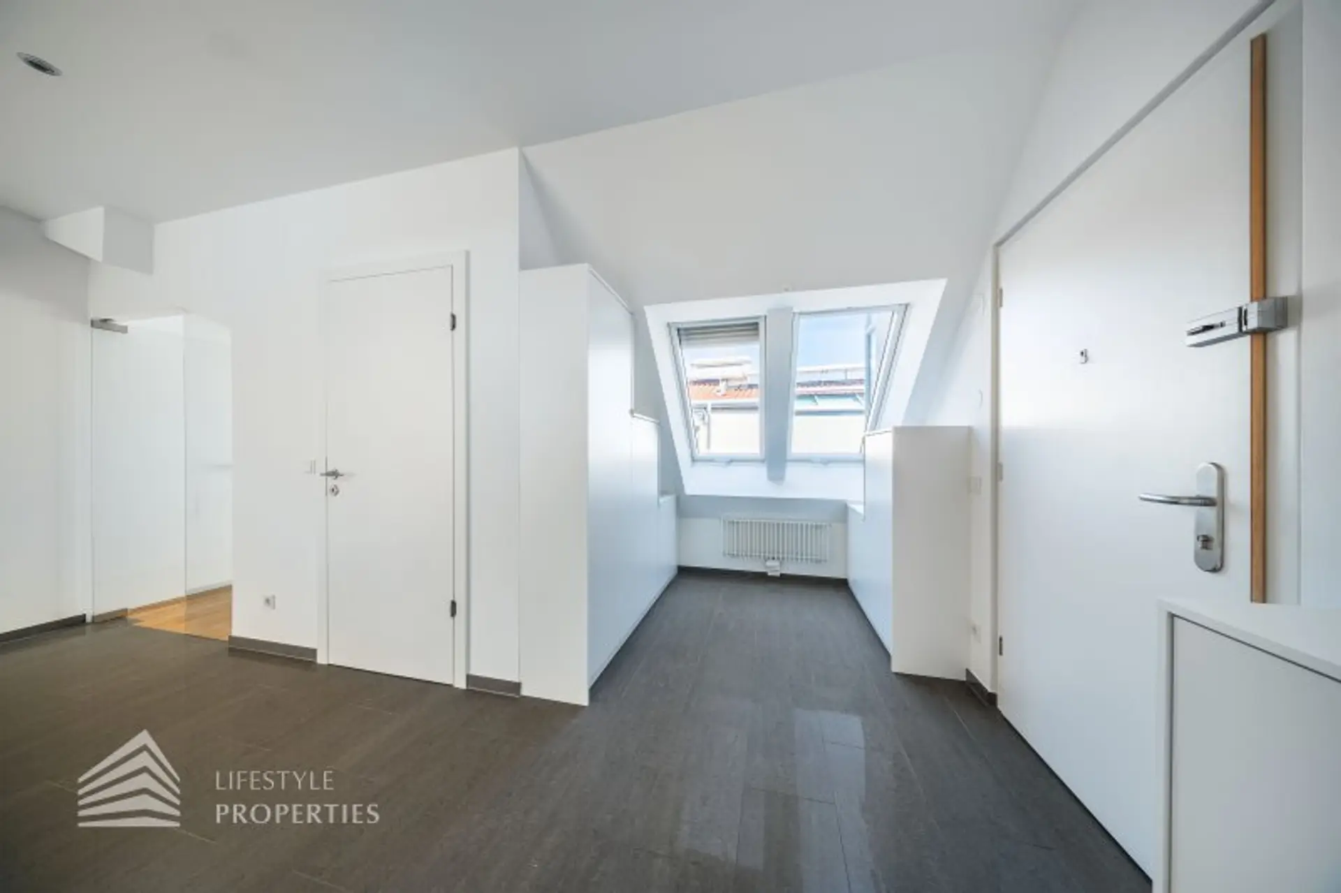 Die Maisonette gliedert sich in der unteren Ebene in ein geräumiges Entrée, einen großen Salon mit offener Küche, der genügend Platz für einen Esstisch und eine gemütliche Wohnecke bietet, die Küche ist vollständig ausgestattet. Das große Zimmer ist eine Galerie, die sich im oberen Teil befindet und im unteren Bereich mit einem Schrankraum und en-suite Bad mit Badewanne, zwei Waschbecken und WC ausgestattet ist. Ein weiteres Zimmer mit en-suite Bad sowie noch ein Zimmer, einen Abstellraum und zwei separate WCs finden Sie auf der unteren Ebene. In der oberen Ebene befindet sich eine weitere Galerie mit Zugang zu den zwei Terrassen, welche teilweise einen wunderschönen Blick auf den Stephansdom bieten. Des Weiteren gibt es im oberen Stockwerk ein weiteres Bad mit Dusche und WC.