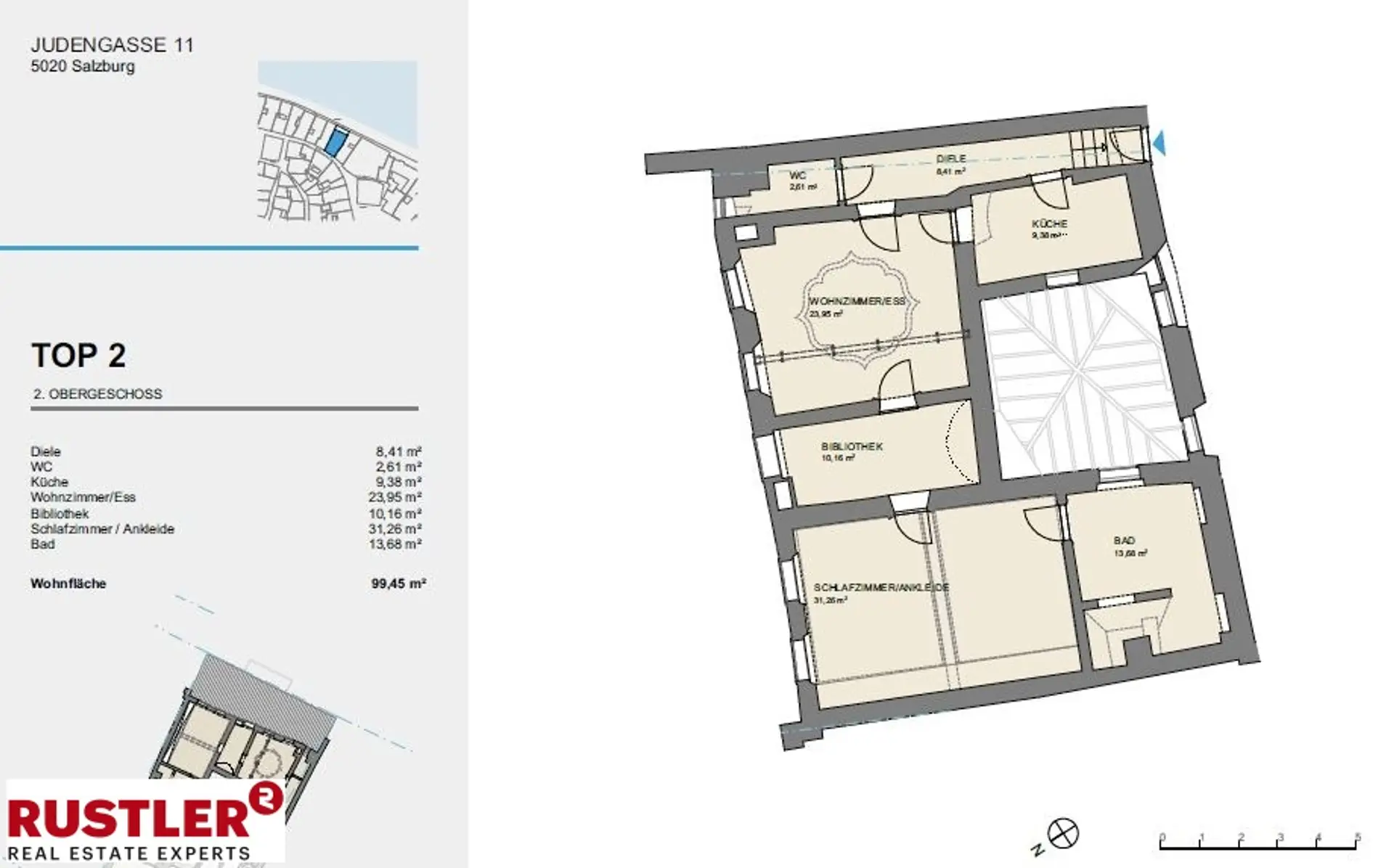 Zur Vermietung gelangt diese charmante 99 qm große Wohnung als Erstbezug nach Komplettsanierung, gelegen im 2. Liftstock einer neu revitalisierten Liegenschaft im Herzen der Salzburger Altstadt, in der Judengasse.