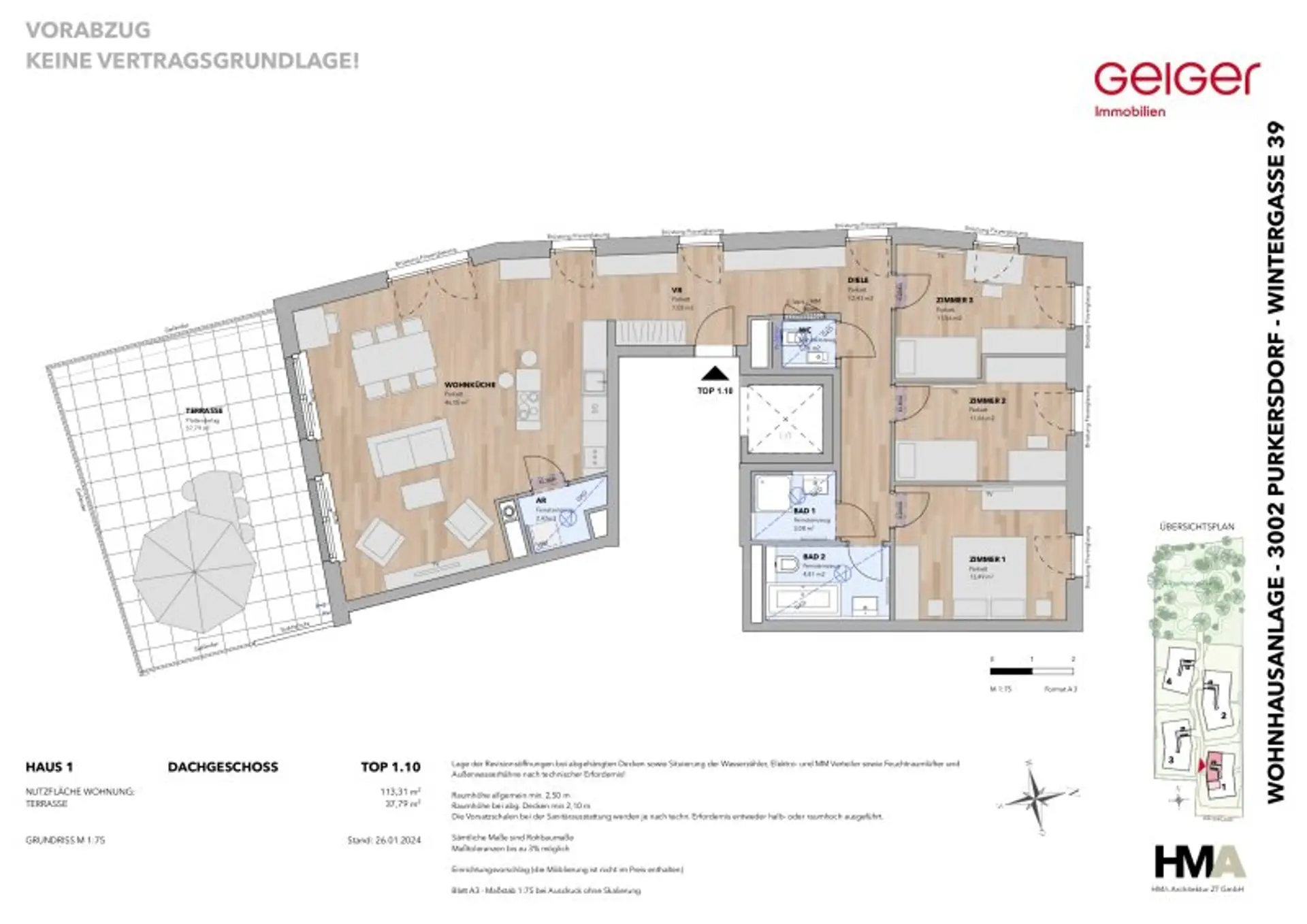 In der zentrumsnahen Wintergasse 39 im beliebten Purkersdorf, errichten wir eine moderne Wohnhausanlage. Diese fügt sich harmonisch in den Hang ein, besteht aus 4 Wohnhäusern mit insgesamt 48 Wohnungen (2-, 3-, 4- und 5-Zimmer Wohnungen), 74 KFZ-Tiefgaragenplätzen, sowie 8 Stellplätzen für Motorräder.