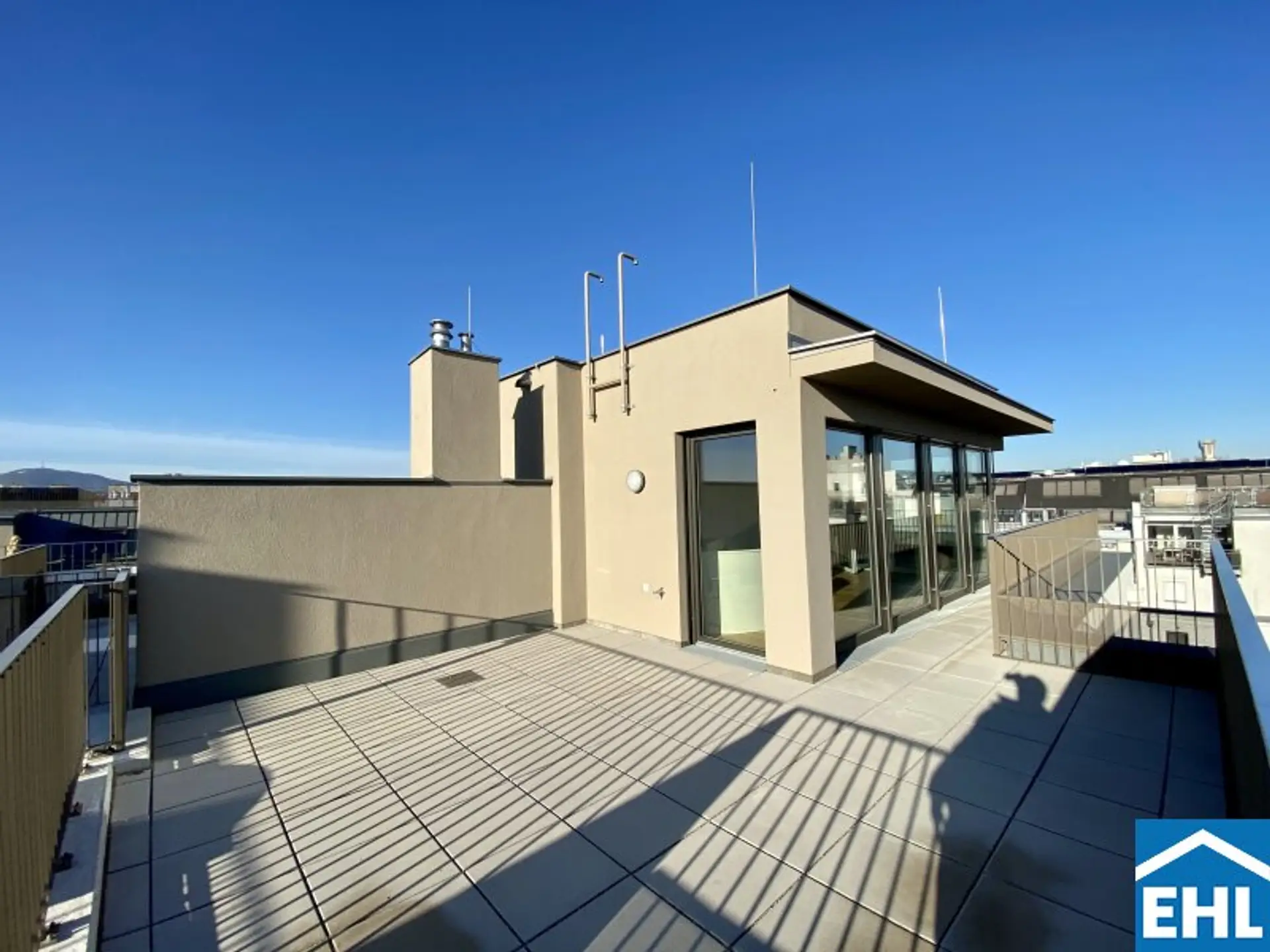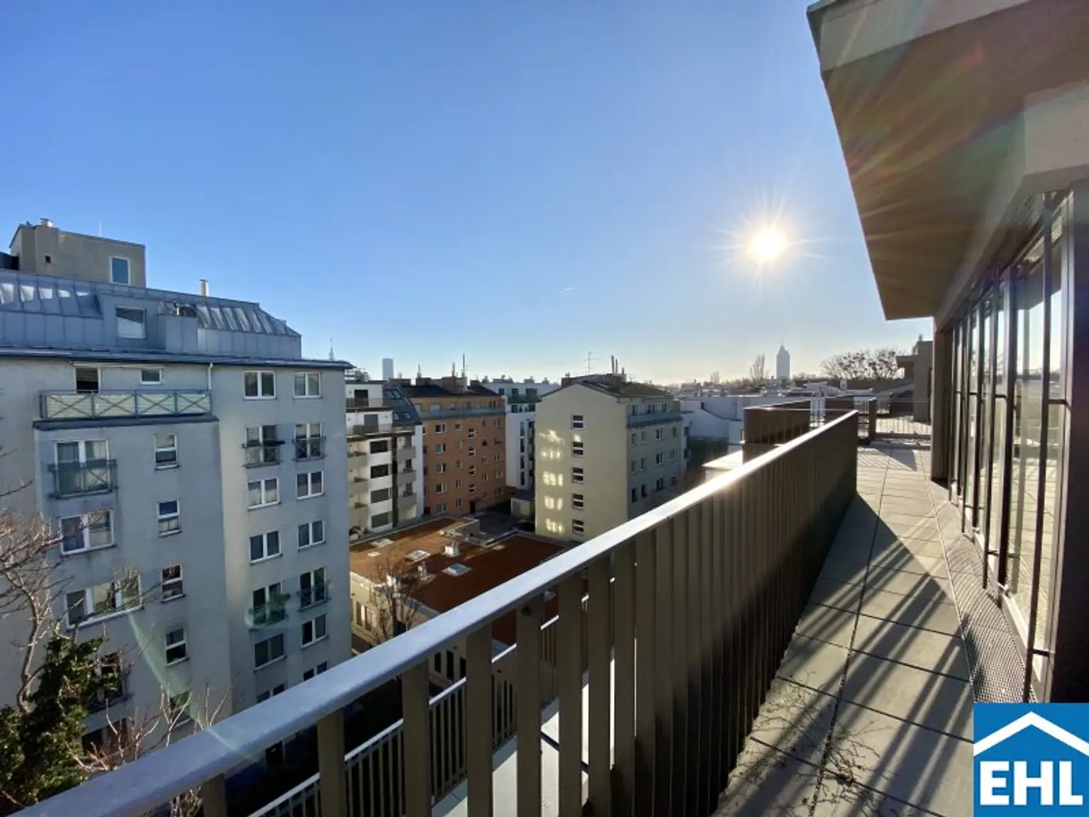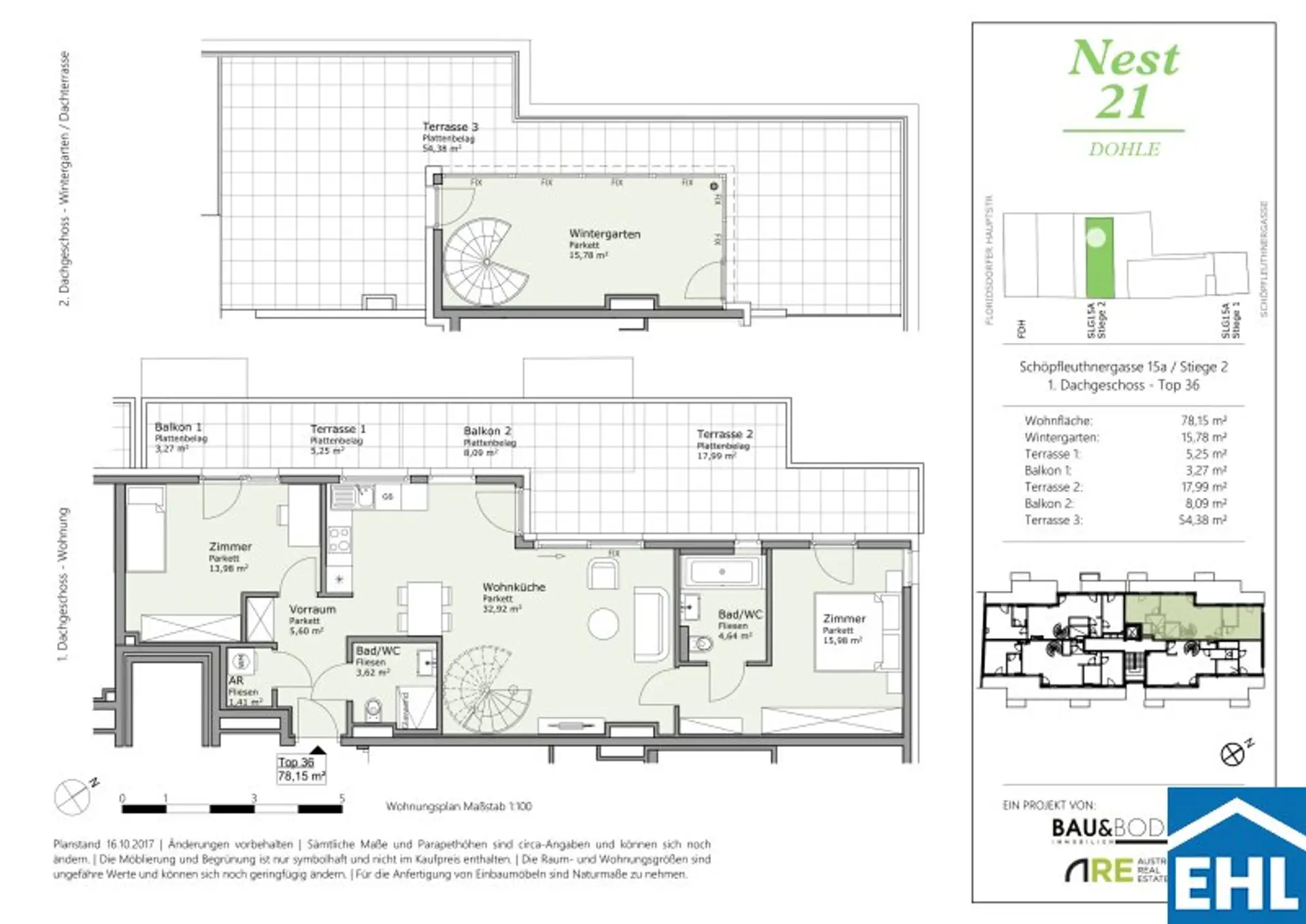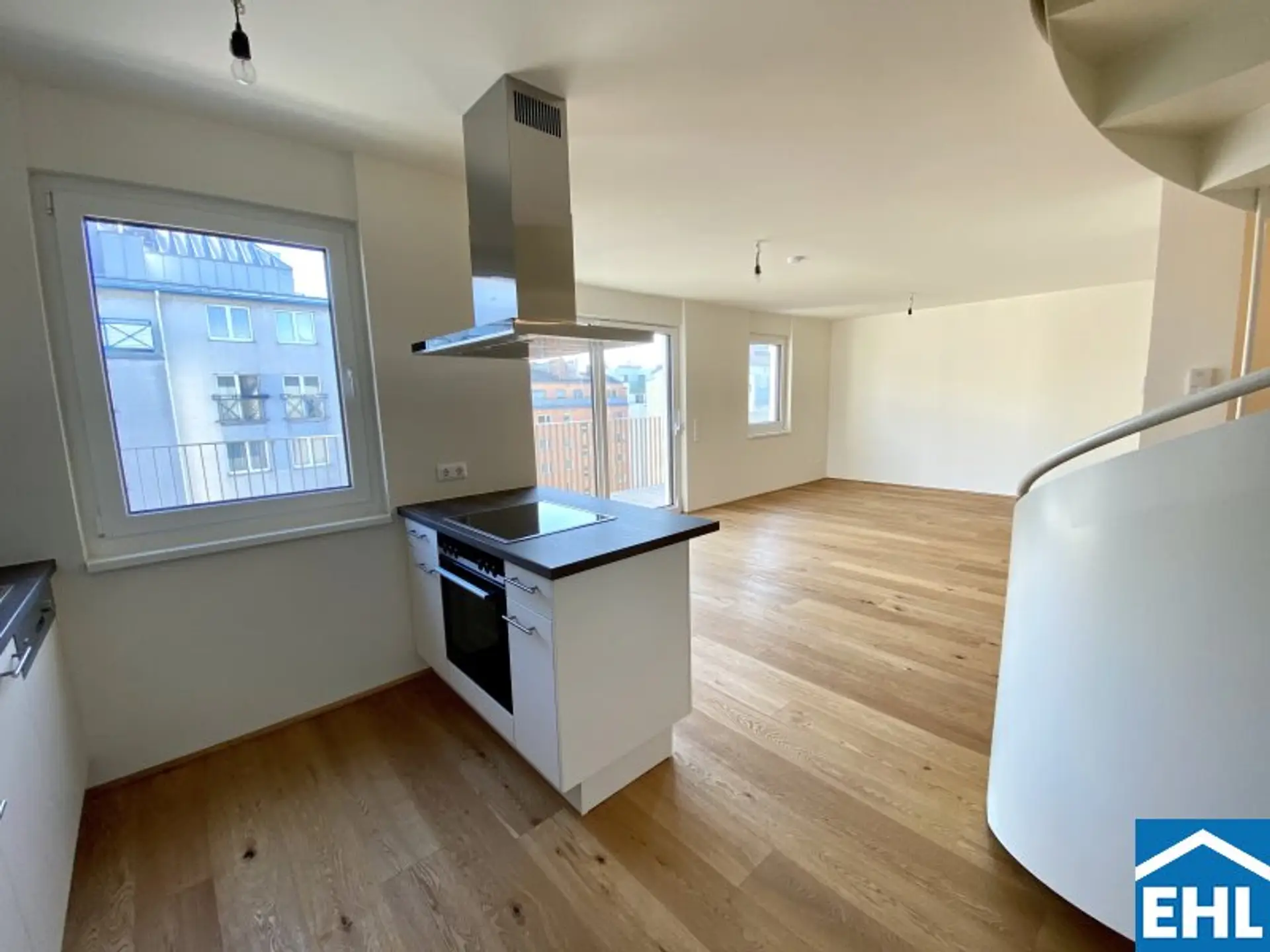 Diese Wohnung befindet sich im Dachgeschoss und erstreckt sich über zwei Wohngeschosse. Diese verfügen über eine geräumige Wohnküche, zwei Schlafzimmer, zwei Badezimmer mit Dusche, Wanne, WC und Waschmaschinenanschluss, einen Abstellraum, sowie über einen Vorraum im 1. Geschoss. Weiters kann die knapp 35m² große Freifläche sowohl über die Wohnküche, als auch über die beiden Schlafzimmer betreten werden. Über eine Wendeltreppe gelangt man in den ca 16m² großen Wintergarten mit Zugang zur 54m² großen Terrasse.