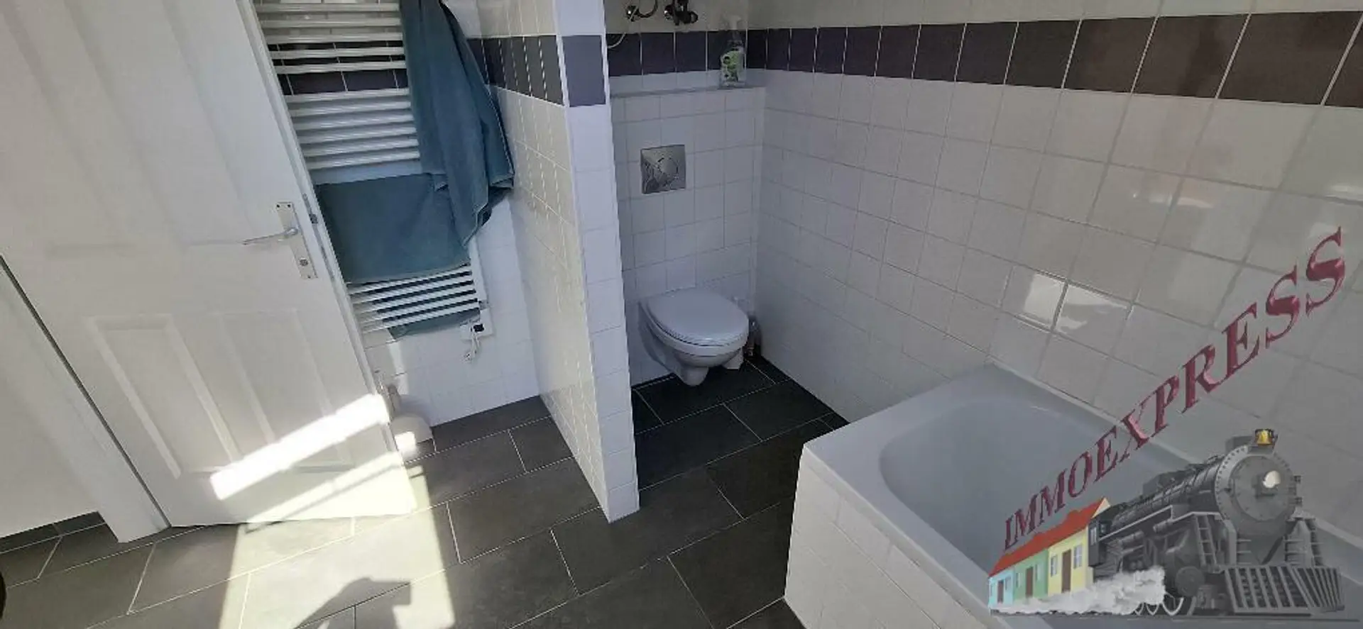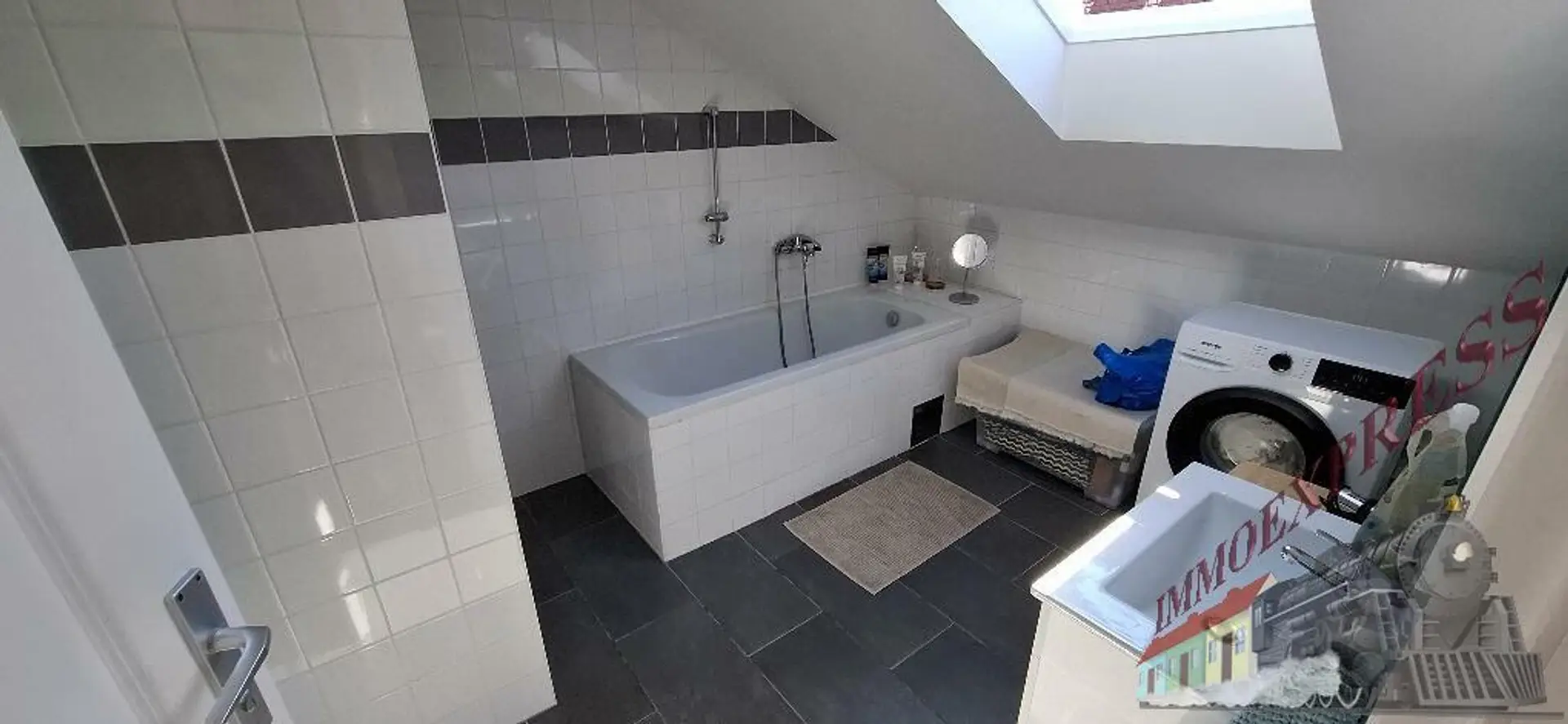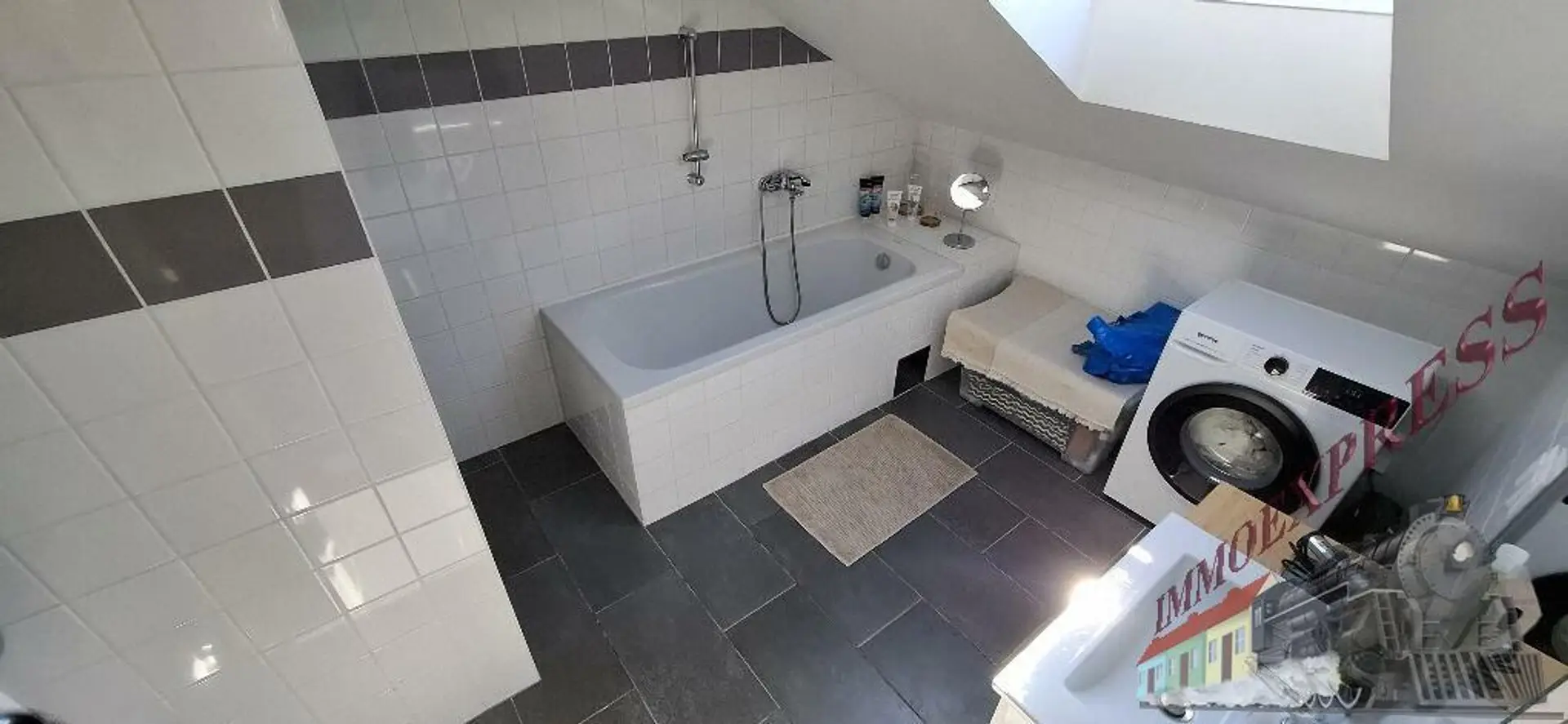 1 Bad mit Dusche, Waschmaschinenanschluss, Waschbecken und Toilette