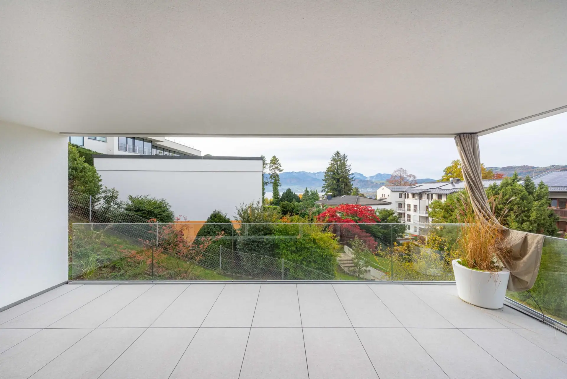 Die Wohnung im 1. Obergeschoss verfügt über einen einladenden Vorraum, ein separates WC, einen Abstellraum, ein traumhaftes Badezimmer sowie zwei Schlafzimmer. Der großzügige Koch-Wohn-Essbereich ist vollständig von der großen Außenfläche umgeben, bietet einen schönen Blick und eine optimale Sonnenausrichtung – perfekt für entspannte Stunden im Freien.