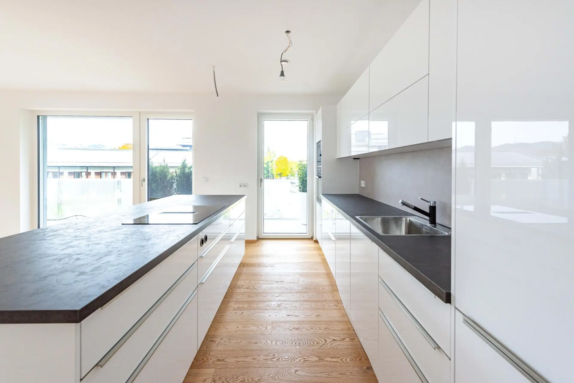 Sorgfältig ausgewählte Materialien und eine hochwertige Ausstattung unterstreichen die besondere Atmosphäre der Wohnung. Ebenso wie die neu eingebaute Küche.