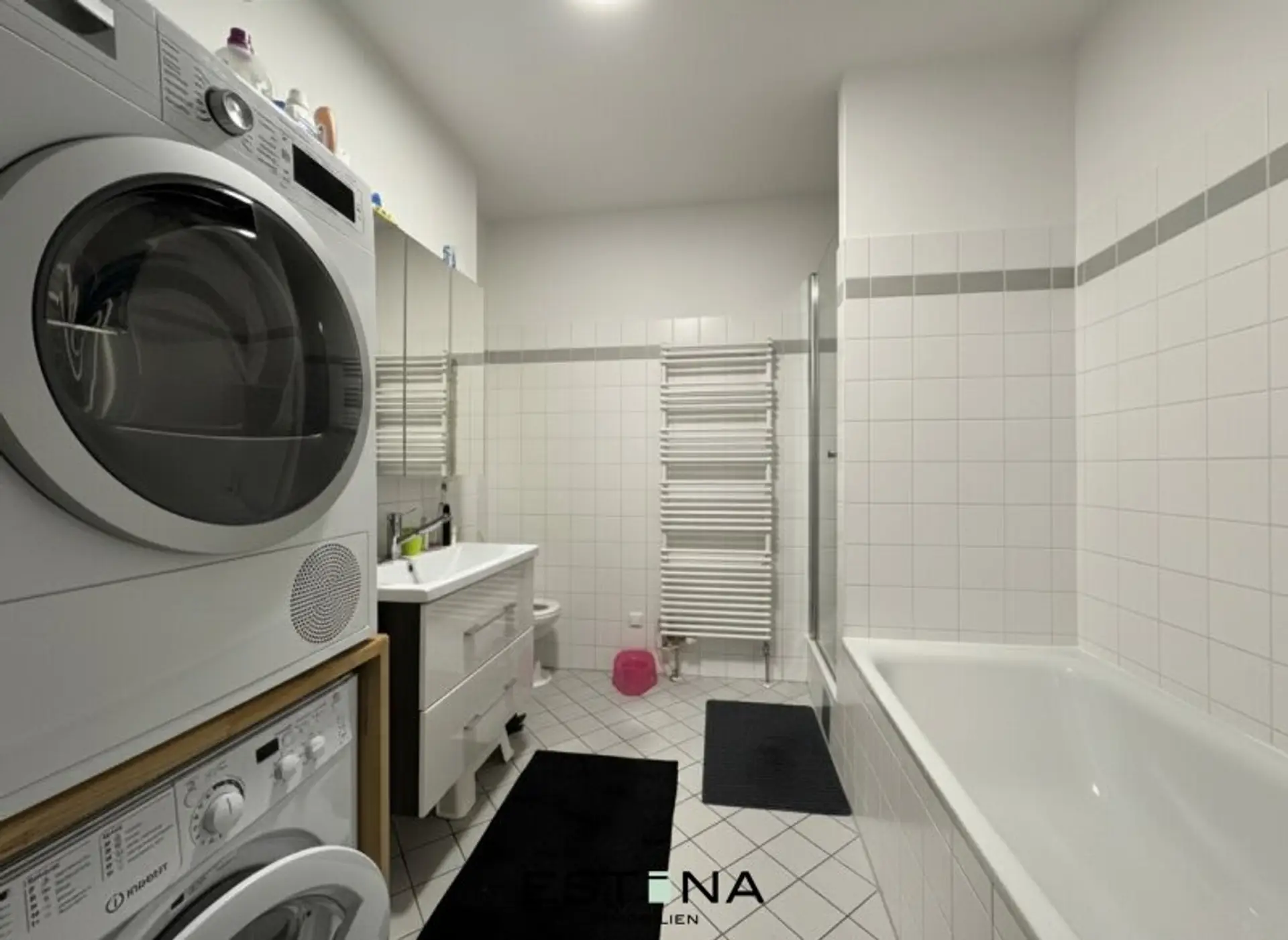 - Badezimmer mit Badewanne und Dusche, Waschbecken, Waschmaschinenanschluss und Toilette