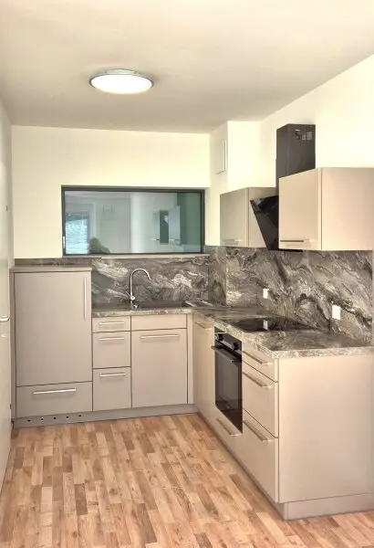 Hochwertige Laminatböden, Fenster und Terrassentüren mit Jalousien sowie eine moderne Küche mit Kühl-/Gefrierschrank, Geschirrspüler, Backofen mit Ceranfeld, Dunstabzug und Spüle unterstreichen den zeitgemäßen Charakter der Wohnung. Beheizt wird mittels Fernwärme, die monatlichen Kosten für Heizung und Warmwasser betragen € 65,00.