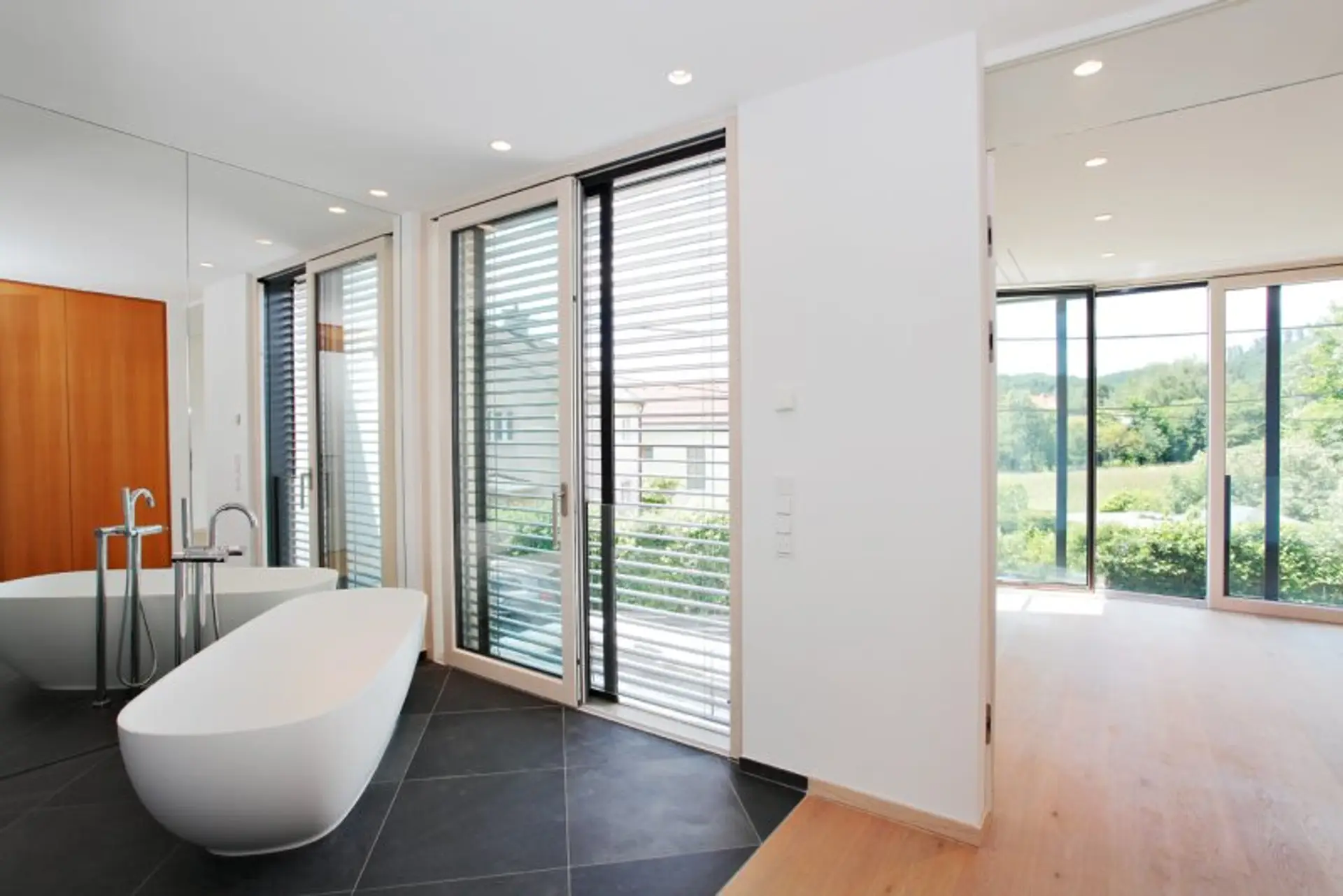 Im 1. Stockwerk befinden sich sehr großzügig angelegte, lichtdurchflutete Schlafräume mit dezent verbauten, eigens beleuchteten Einbauschränken. Jedes der 3 Schlafzimmer hat ein Bad-en-Suite (das Masterbadezimmer mit freistehender Badewanne und Blick in den angrenzenden Wienerwald), bietet einen großen Komfort und geht auf die individuellen Bedürfnisse aller Familienmitglieder ein. Auch hier wurden wieder extravagante, modern architektonische Lösungen für die Badezimmer-Ausstattung gewählt.