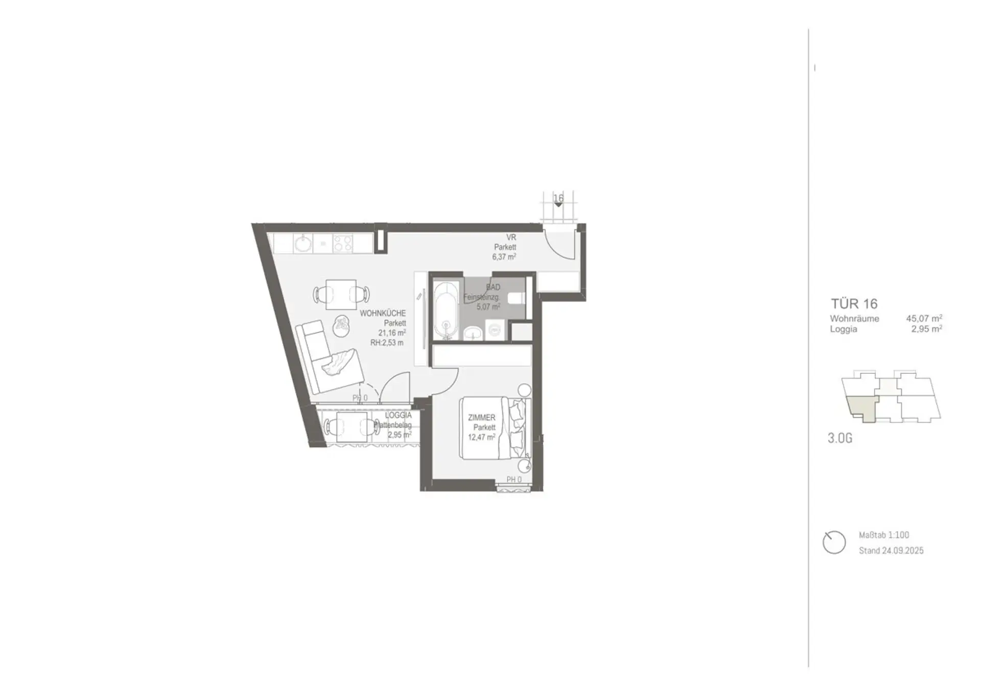 Vom Vorzimmer mit Nische für eine Garderobe geht es ins Wohnesszimmer und Badezimmer. Das Wohnesszimmer ist auf die sonnigen Loggia ausgerichtet. Über das Wohnesszimmer erreicht man das Schlafzimmer.