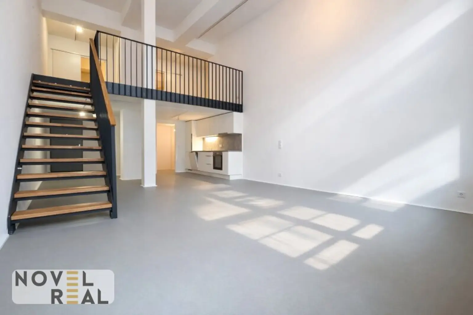 Die untere Ebene der Maisonette empfängt mit einem weitläufigen Wohnbereich, dessen beeindruckende Raumhöhe und offene Sichtachsen sofort ein Gefühl von Großzügigkeit vermitteln. Der Wohnraum geht harmonisch in die Küche über, die mit ihrer klaren Strukturierung und der Nähe zum Balkon ideal für kommunikatives Wohnen gestaltet ist. Große Fensterflächen lassen den gesamten Bereich in Tageslicht erstrahlen und schaffen eine elegante Verbindung zwischen Innenraum und Außenbereich.